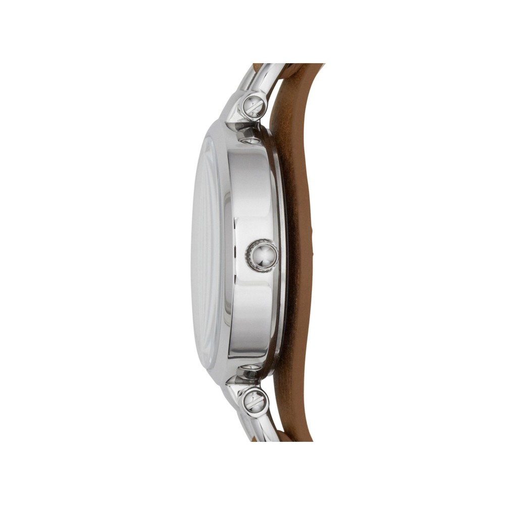 Цвет товара корпус- серебристый, циферблат- серебристый, крепление- темно-коричневый
