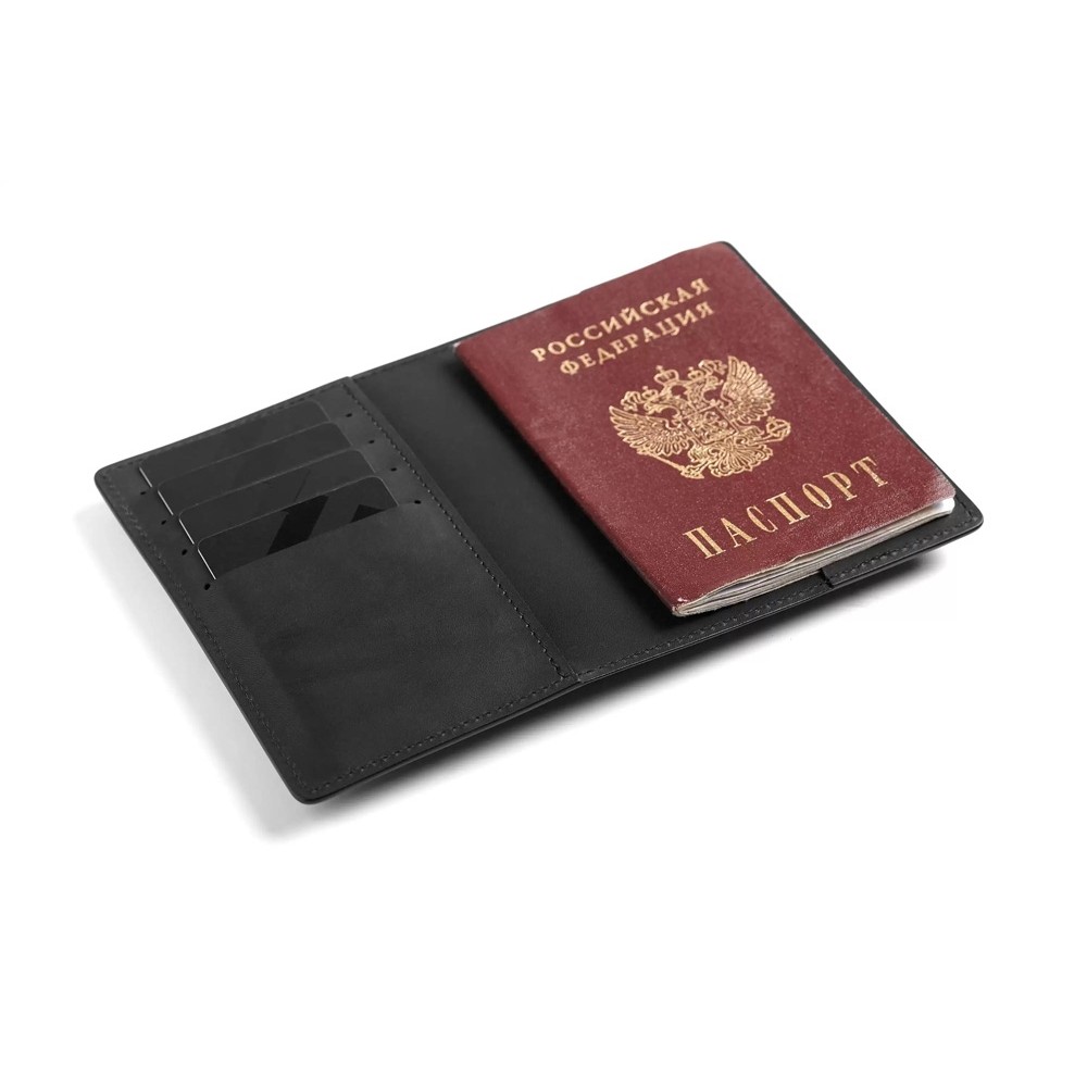 Классическая обложка из дублированной кожи, прокрашенные края, аккуратный шов, прорези для четырёх карт, место для паспорта и документов на машину.