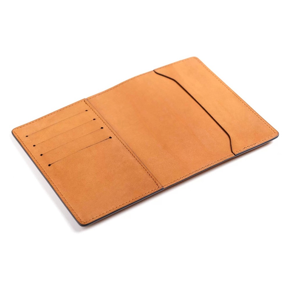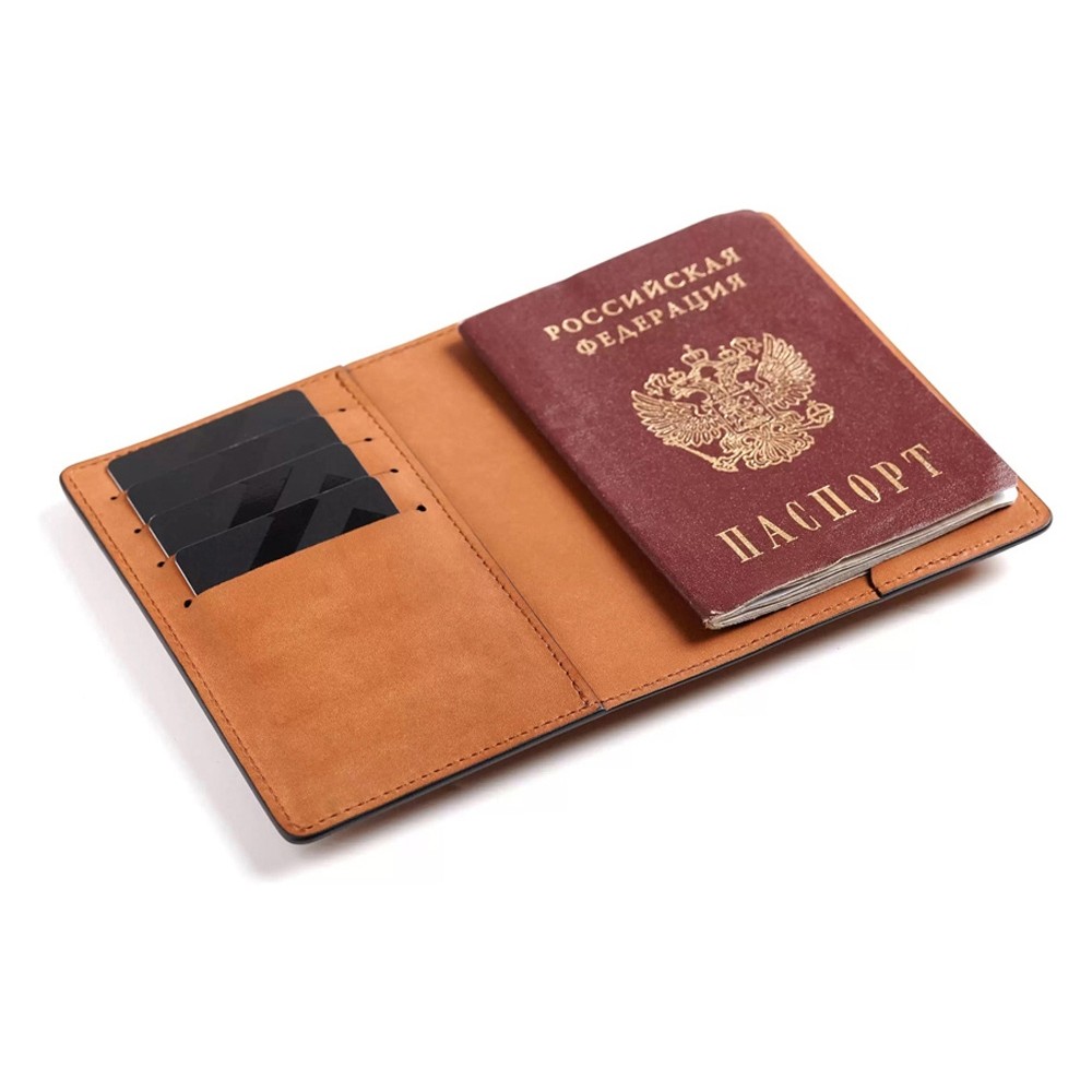 Классическая обложка из дублированной кожи, прокрашенные края, аккуратный шов, прорези для четырёх карт, место для паспорта и документов на машину.