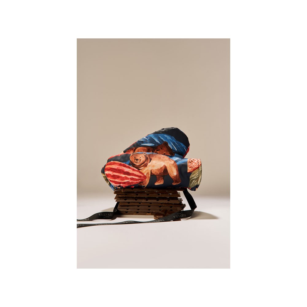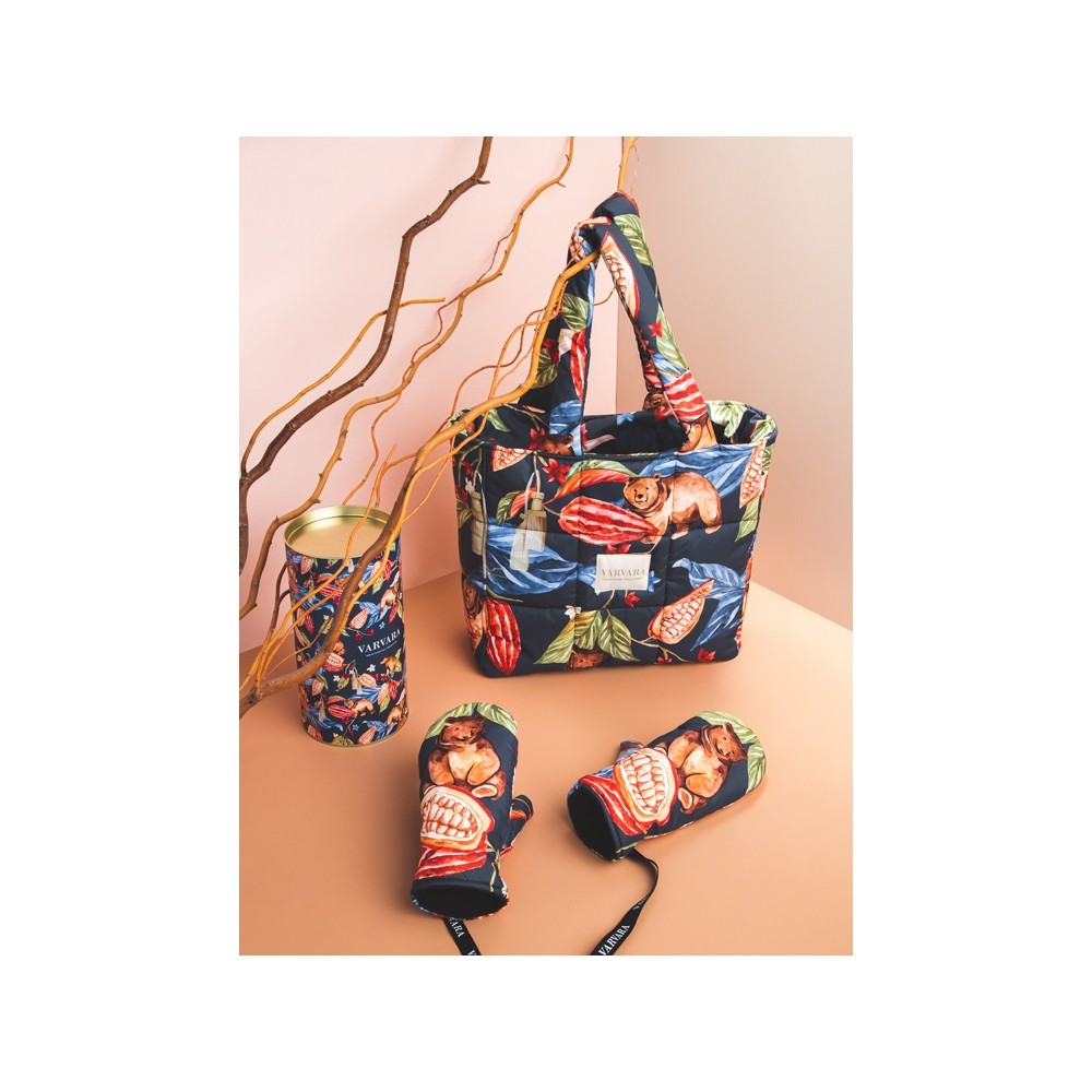 Принт «Мишки в шоколаде» продолжает серию сказочных принтов Varvara. Задорные медвежата прячутся в листьях и плодах вечнозеленого какао, создавая яркий, эмоциональный узор.