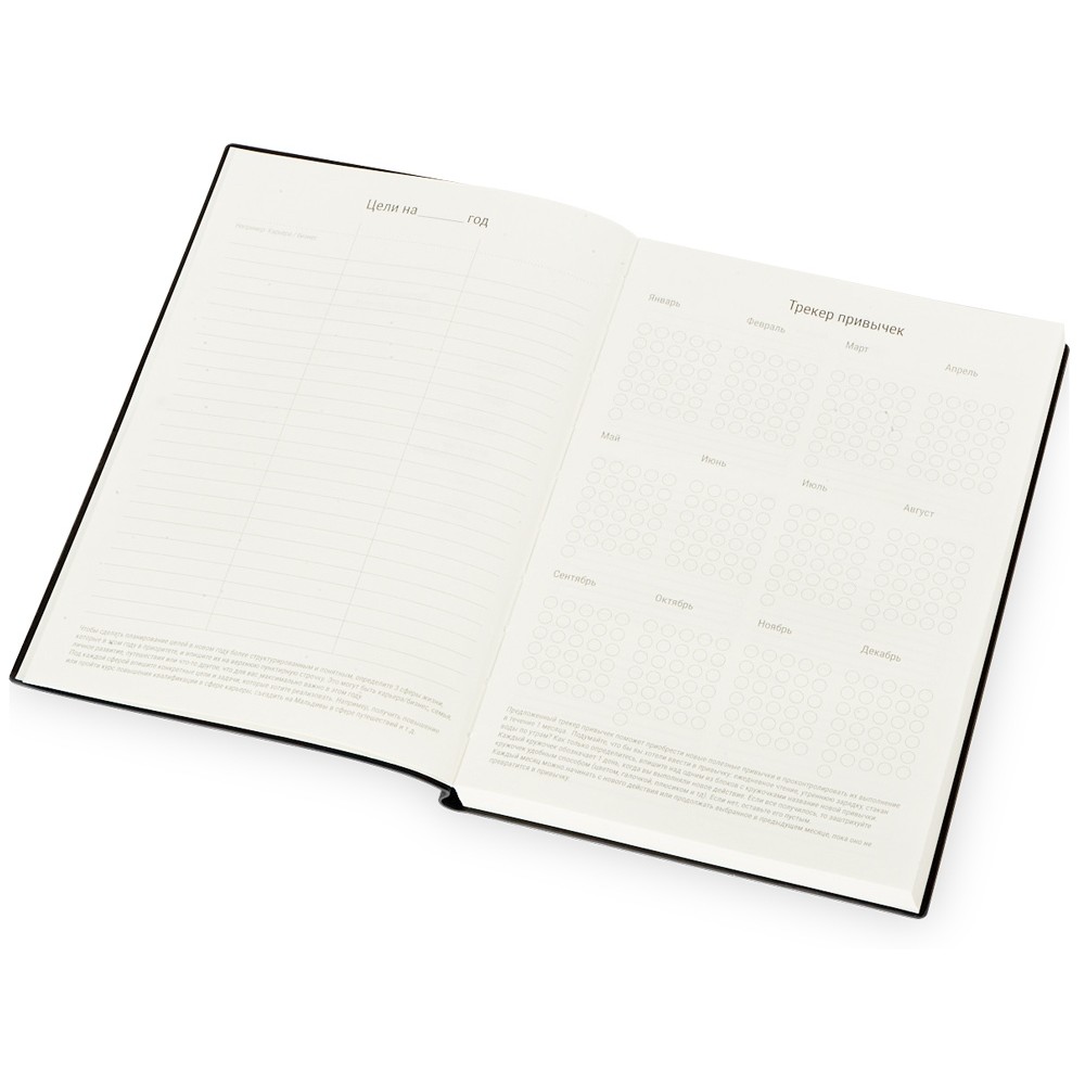 Бумажный блок выполнен из бумаги, полученной из древесины из специальных восполняемых лесных ресурсов, имеет сертификат FSC, международной некоммерческой организации лесного попечительского совета. Линовка — недатированный ежедневник, а на первых страницах вы встретите специальные листы для постановки целей на год и подведения итогов, а также другие трекеры.
