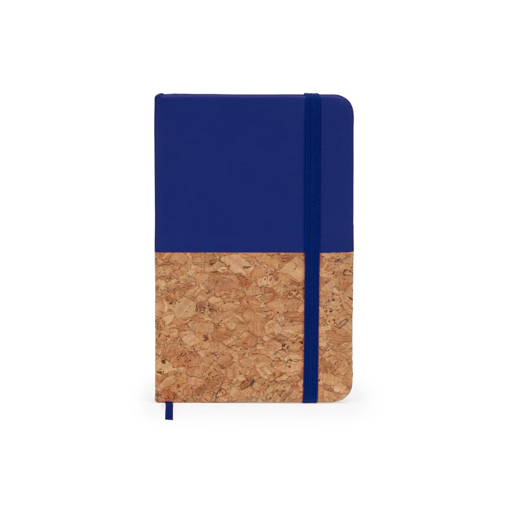 Блокнот формата А6. Комбинированная обложка из искусственной кожи и пробки. 80 нелинованных листов. Также у блокнота есть ляссе и резинка для фиксации.