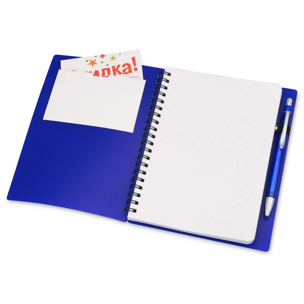 Блокнот «Контакт» в полипропиленовой обложке переплетен на пружине. В обложке блокнота предусмотрено окошко, в которое можно поместить визитную карточку или полиграфическую вставку. В комплекте с блокнотом идет ручка, которая вставляется в петельку сбоку.