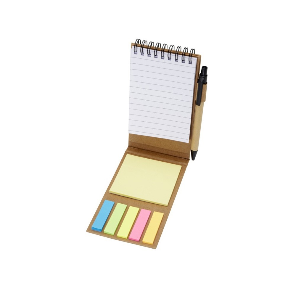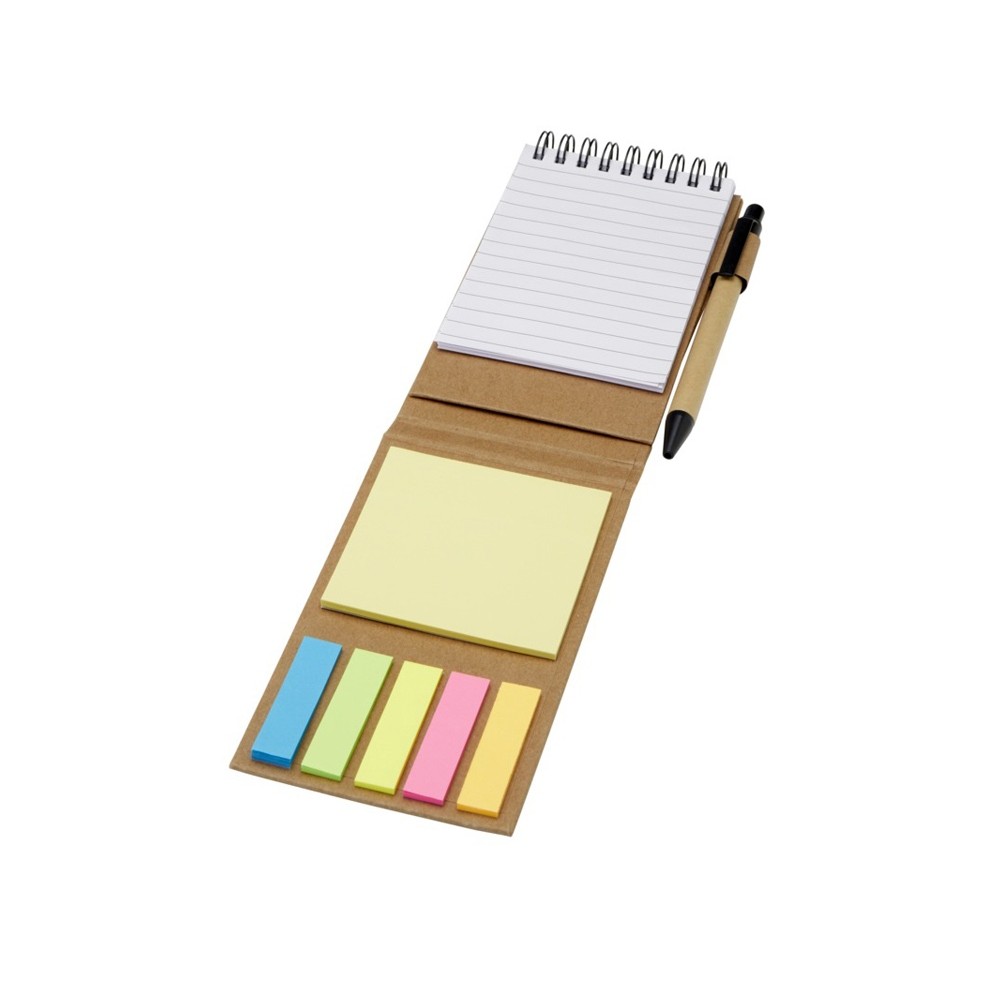 Липкий блокнот с шариковой ручкой. В блокноте 30 листов белой линованной бумаги плотностью 70 г/м2 (8 x 12 см). В комплект также входят 25 разноцветных (5 x 1,2 см) и 25 желтых (7,5 x 7,5 см) клейких листочков, оба типа на бумаге плотностью 70 г/м2. Корпус шариковой ручки изготовлен из переработанной бумаги. Цвет чернил: черный. Длина непрерывной линии: 1000 метров. Размер пера: 1,00 мм.
