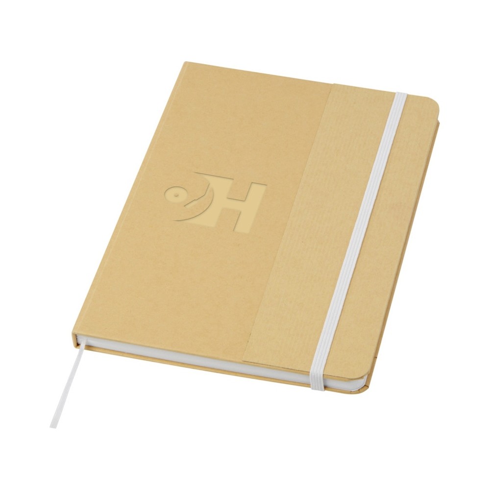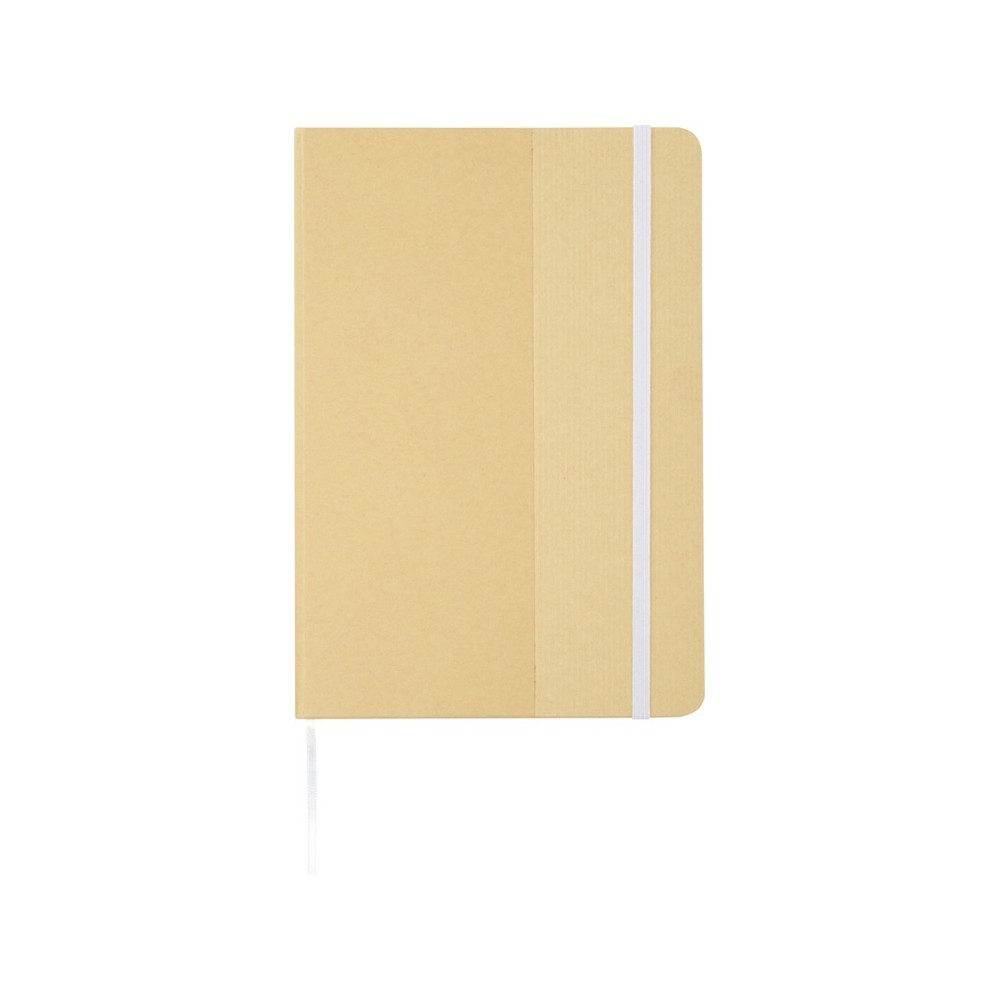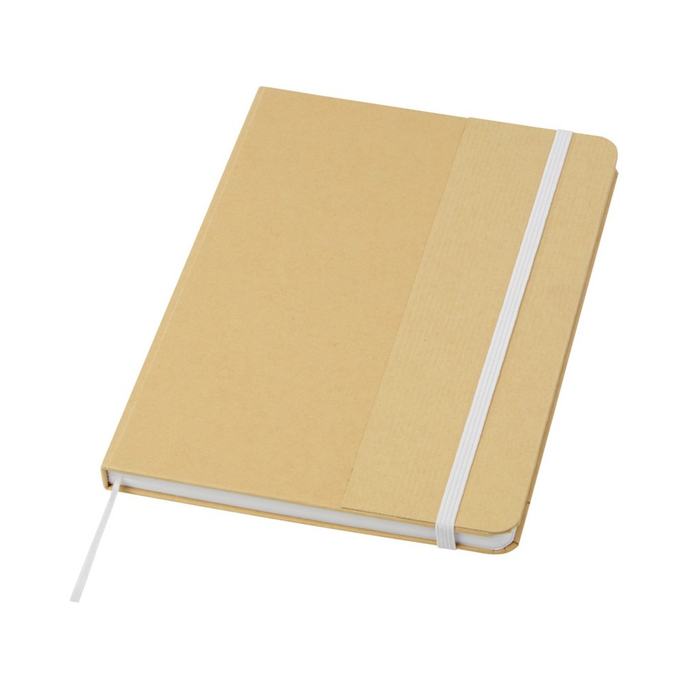Блокнот формата А5 в твердой обложке из переработанного картона, 80 листов бумаги плотностью 70 г/м² в линейку. Блокнот имеет эластичную застежку, ленту и закругленные углы. FSC certified paper. FSC Mix 100% P7.1 CU-COC-877277.