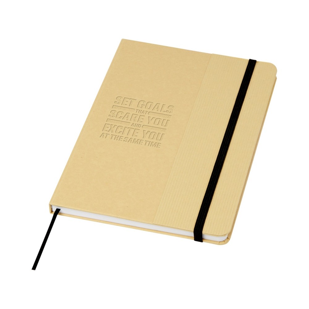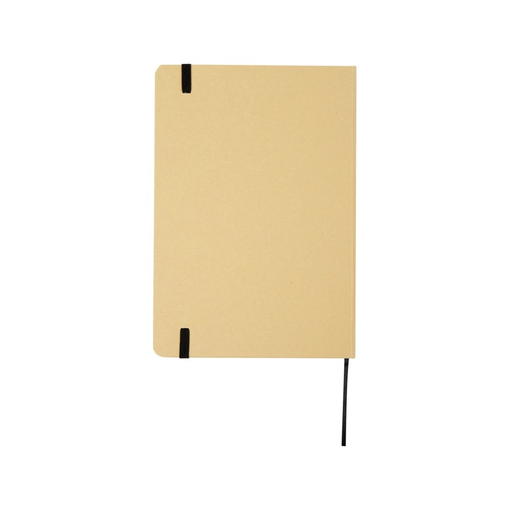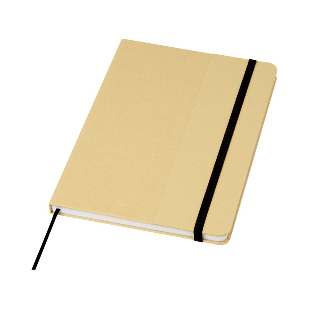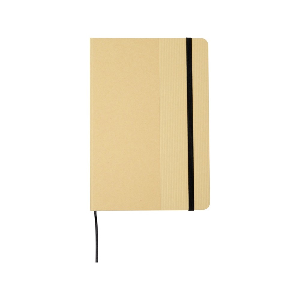 Блокнот формата А5 в твердой обложке из переработанного картона, 80 листов бумаги плотностью 70 г/м² в линейку. Блокнот имеет эластичную застежку, ленту и закругленные углы. FSC certified paper. FSC Mix 100% P7.1 CU-COC-877277.