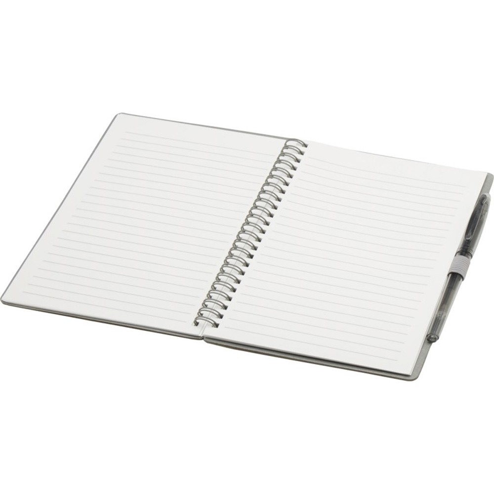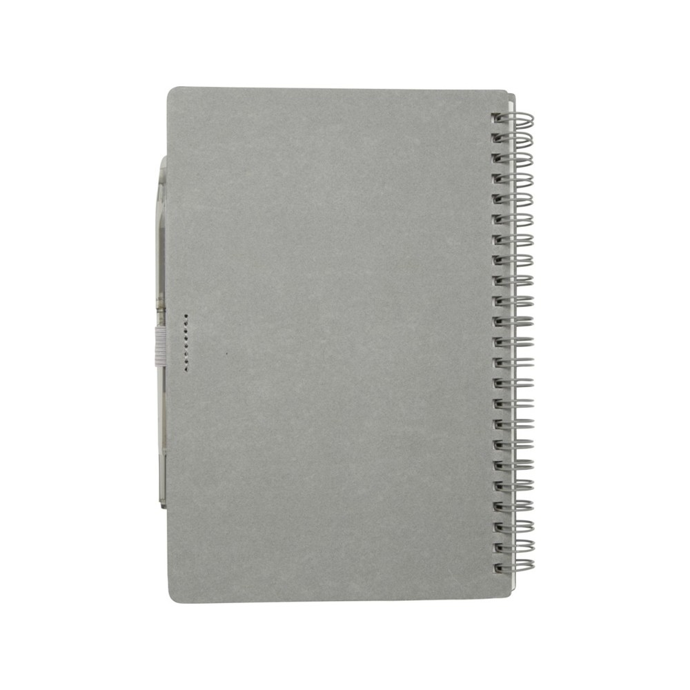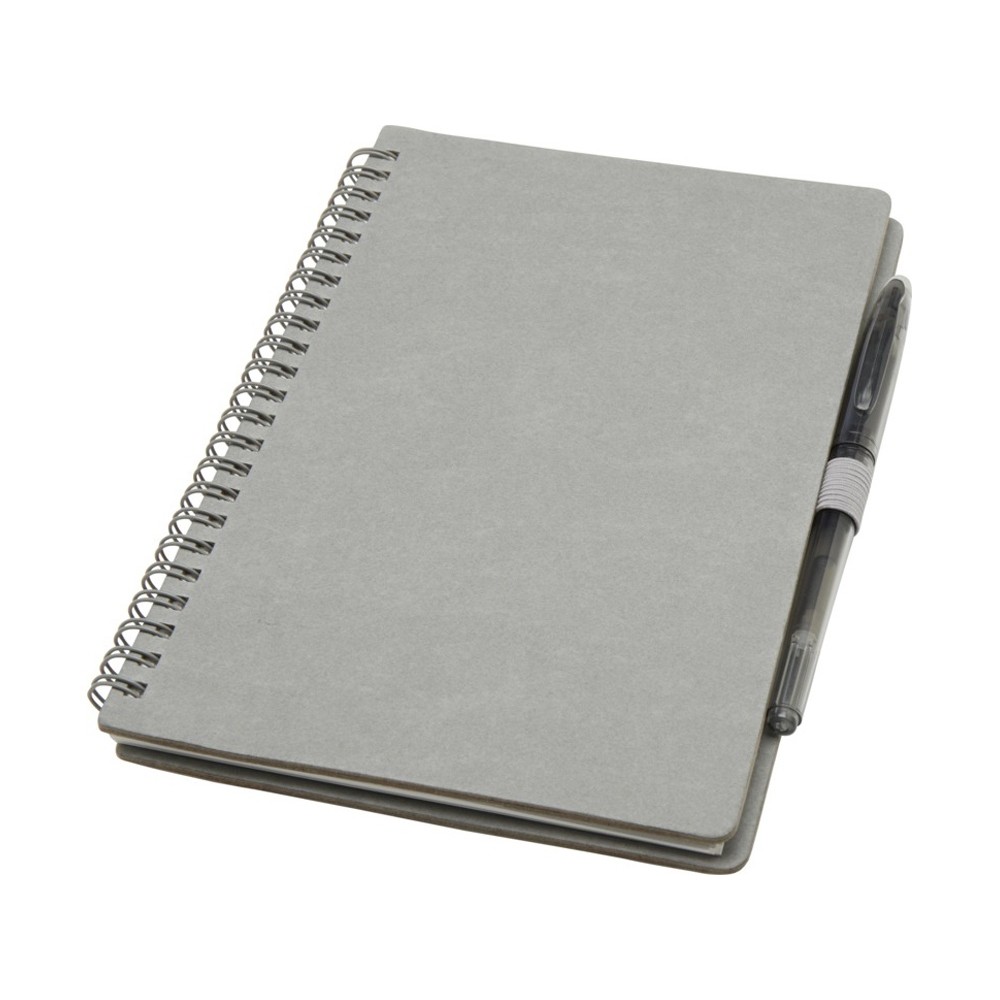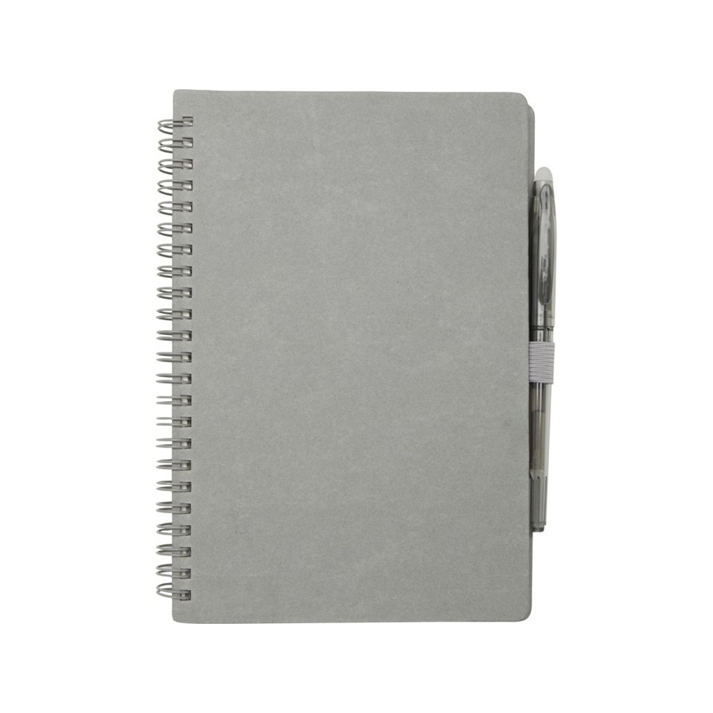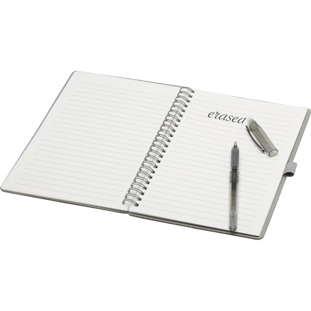 Многоразовый набор из ручки и блокнота в мягкой обложке из каменной бумаги. Блокнот имеет обложку из картона, закругленные углы и 32 листа линованной бумаги плотностью 120 г/м². В производстве каменной бумаги не используется дерево, а на сам процесс изготовления затрачивается гораздо меньше энергии в сравнении с производством переработанной или целлюлозной бумаги. Сзади имеется карман для хранения черной протирочной ткани (входит в комплект). Ручка из переработанного пластика с стираемыми чернилами, прозрачным корпусом, белым ластиком сверху и однотонной цветной рукояткой. Цвет чернил: черный. Длина непрерывной линии: 250 метров. Размер пера: 0,7 мм.