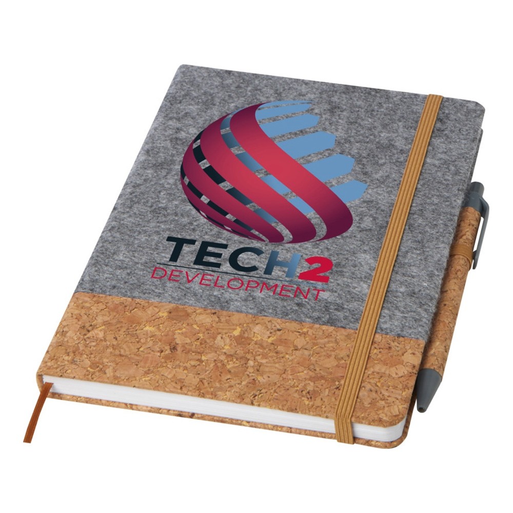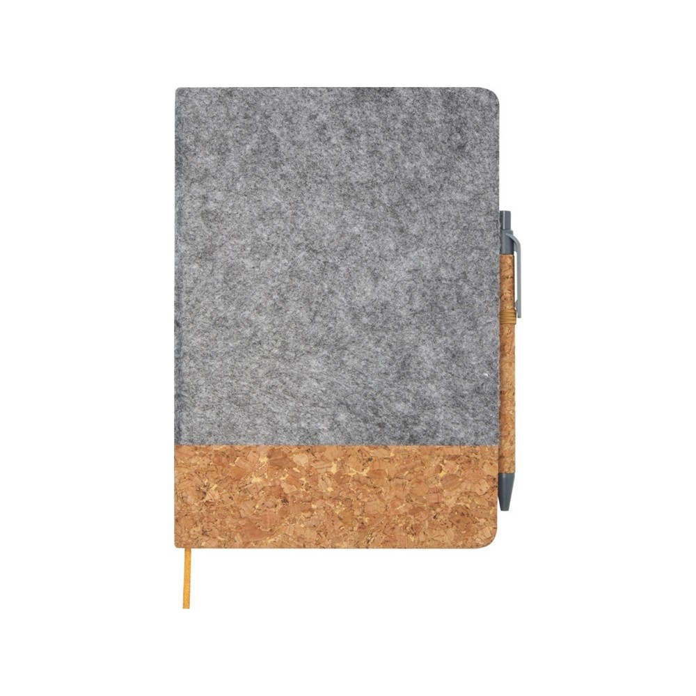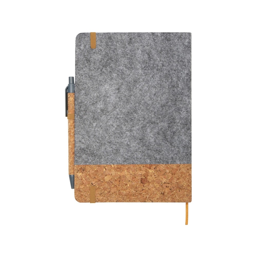 Блокнот формата A5 в твердой обложке изготовлен из пробки и переработанного фетра и состоит из 80 разлинованных листов бумаги плотностью 70 г/м², эластичной застежки, закладки-ленты и петли для ручки. Кнопка, зажим и кончик шариковой ручки изготовлены из переработанного пластика, а корпус — из пробки. Чернила для ручки: черный. Длина непрерывной линии: 600 метров. Размер пера: 1,0 мм. FSC certified paper, Cork, Фетр. FSC Mix Credit P7.1 CU-COC-877277.
