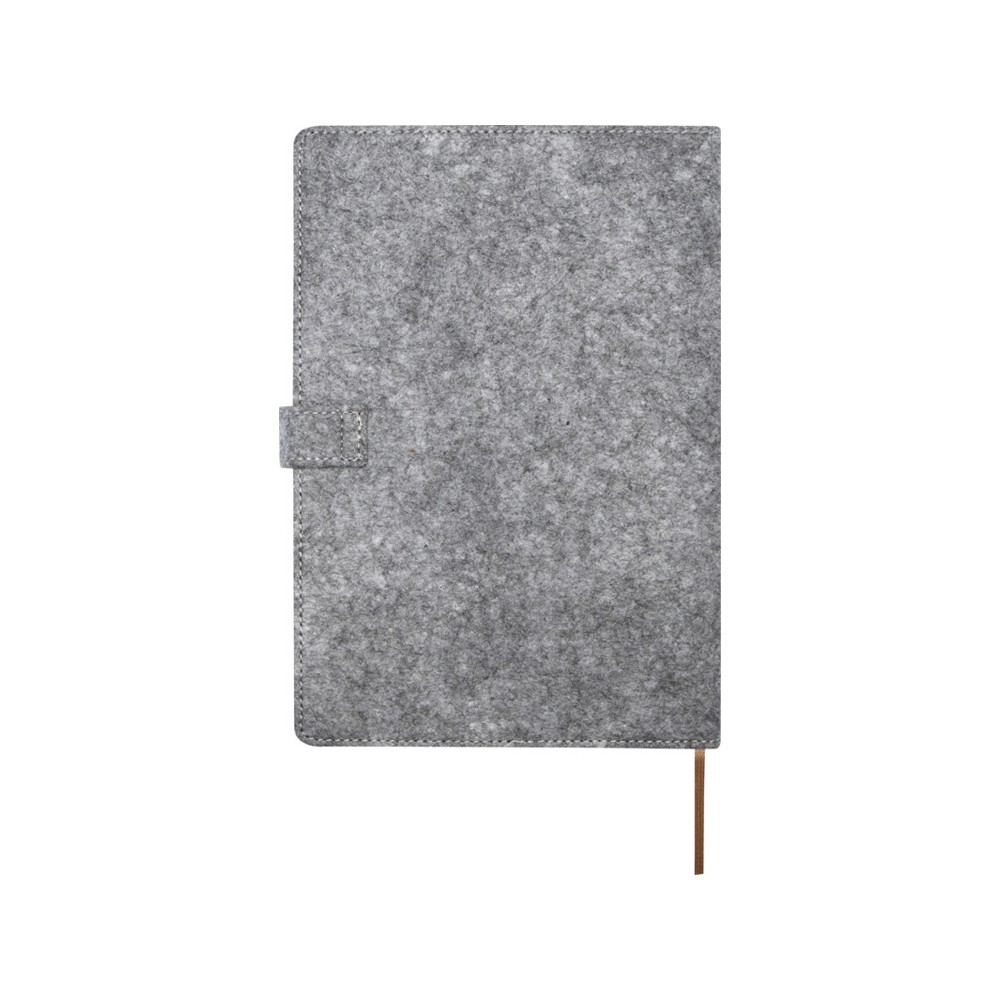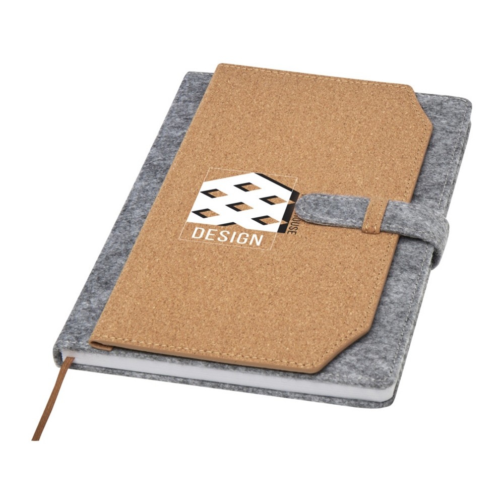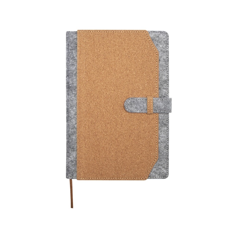 Блокнот формата А5 в твердой обложке из переработанного фетра и пробки, 80 листов бумаги плотностью 70 г/м² в линейку. Блокнот имеет 3 кармана для визиток, коричневую ленту в тон и закругленные углы. FSC certified paper, RPET felt, FSC certified cork. FSC Mix 100% P7.1 CU-COC-877277.
