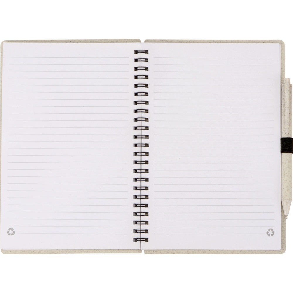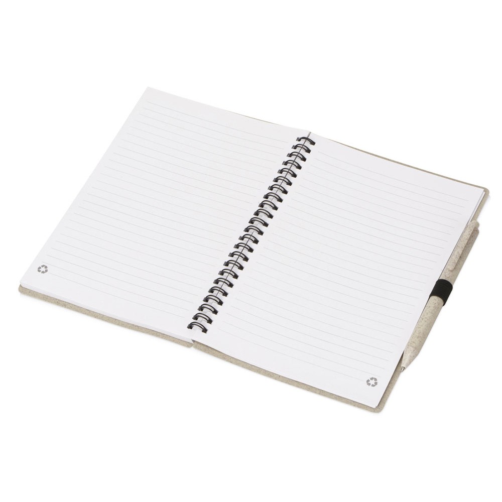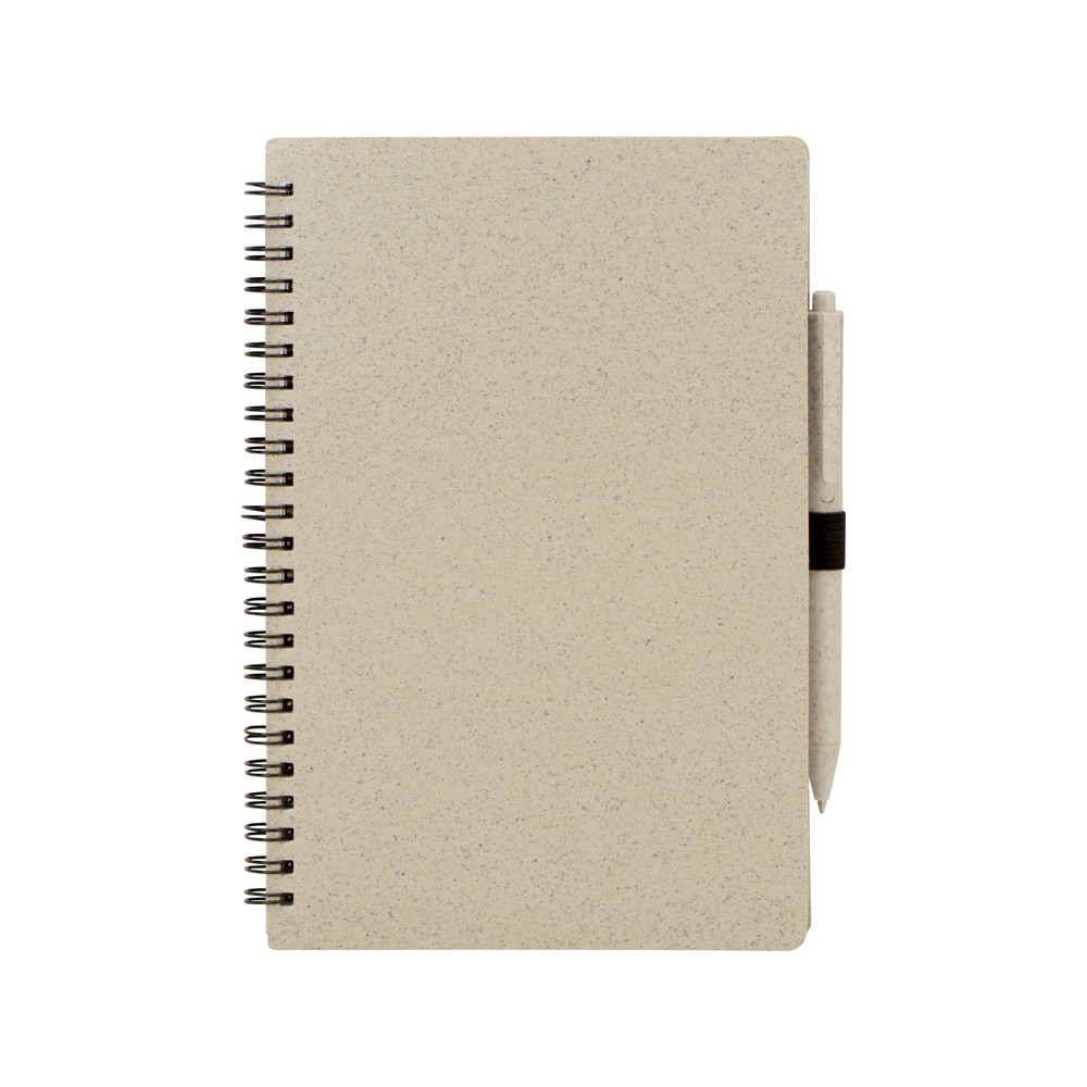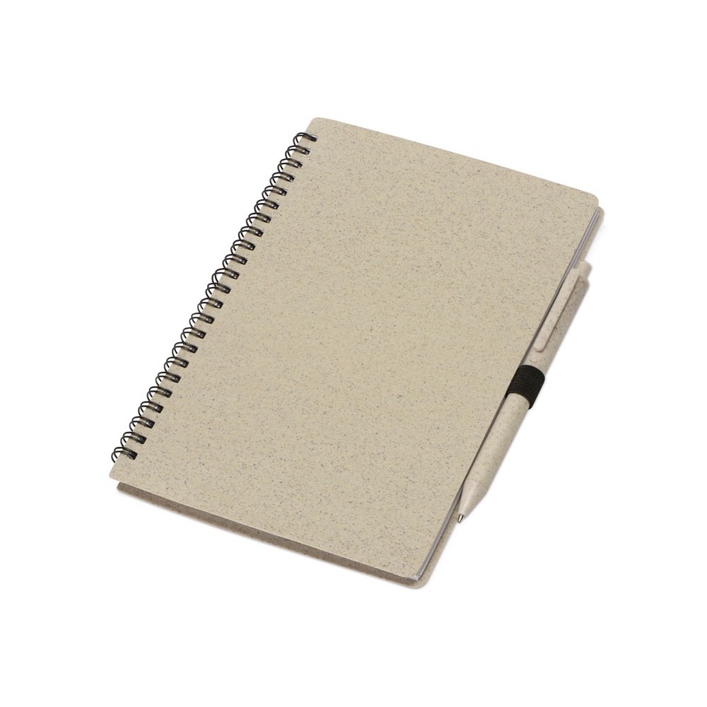 Блокнот с обложкой из переработанной пшеницы и пластика. Блок состоит из 80 листов переработанной бумаги белого цвета. Крепление - пружина. В комплекте шариковая ручка в тон блокноту из пшеничной соломы.