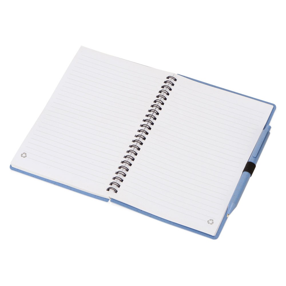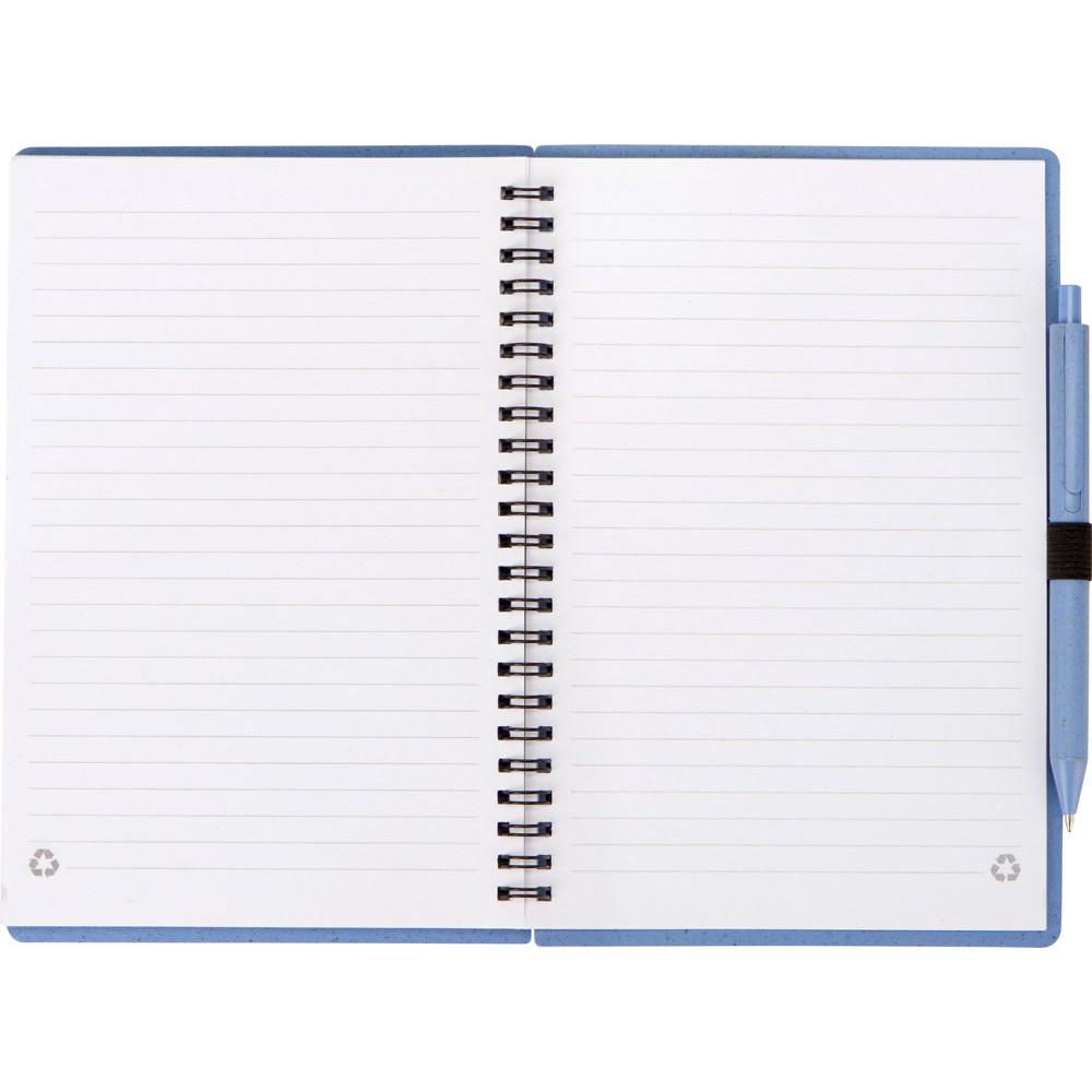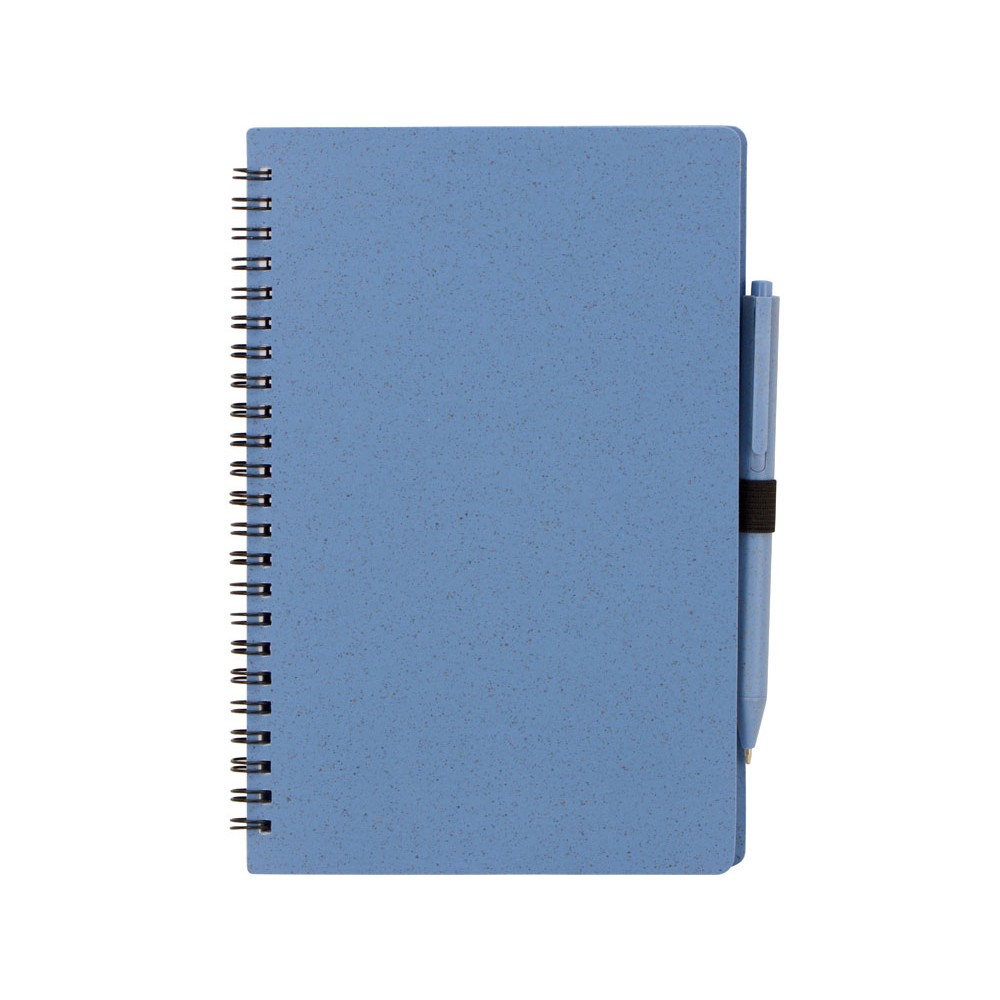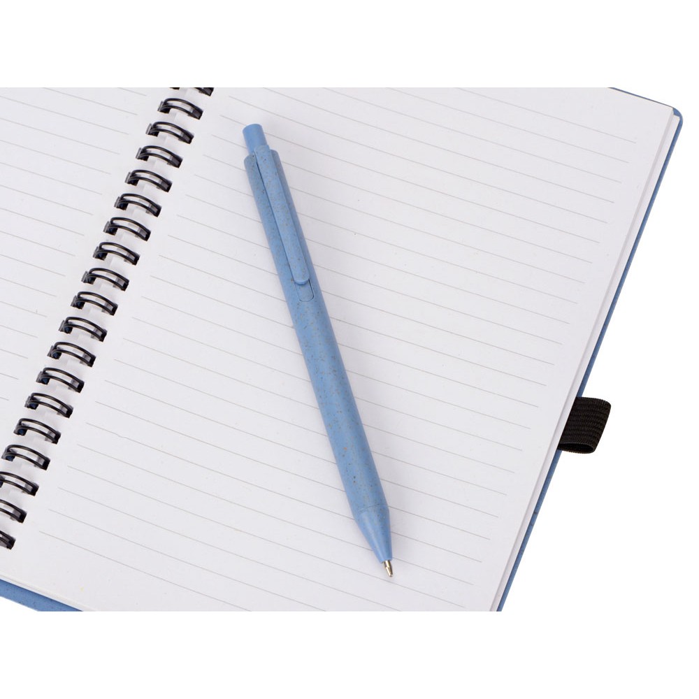 Блокнот с обложкой из переработанной пшеницы и пластика. Блок состоит из 80 листов переработанной бумаги белого цвета. Крепление - пружина. В комплекте шариковая ручка в тон блокноту из пшеничной соломы.