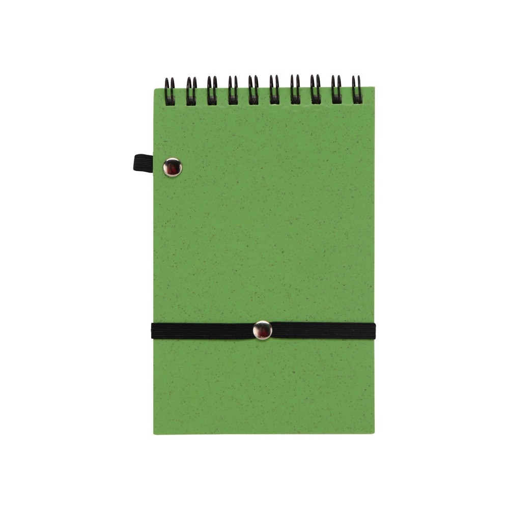 Блокнот с обложкой из переработанной пшеницы и пластика. Блок состоит из 60 листов переработанной бумаги белого цвета. Крепление - пружина. В комплекте шариковая ручка из пшеничной соломы.