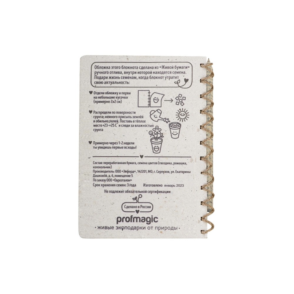 «Живой Блокнот» - это блокнот ручной работы с семенами цветов внутри обложки. Блок на 50 листов сделан из экологичной неотбеленной бумаги, вместо пружины используется льняной шпагат. Блокнот поставляется с бумажным карандашом в наборе. После использования блокнота, вырвите обложку, порвите ее на кусочки и посадите в землю. Поливайте, и уже через несколько недель вы увидите первые всходы.