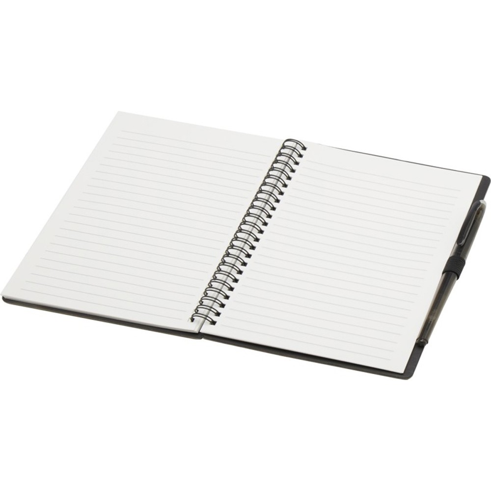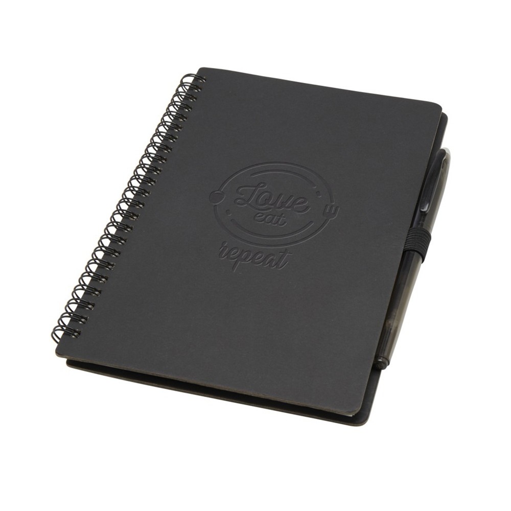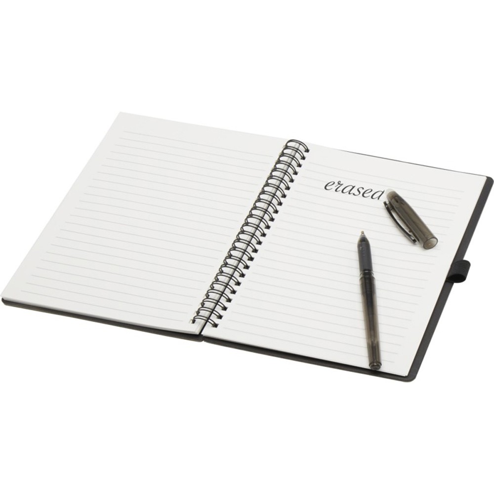 Многоразовый набор из ручки и блокнота в мягкой обложке из каменной бумаги. Блокнот имеет обложку из картона, закругленные углы и 32 листа линованной бумаги плотностью 120 г/м². В производстве каменной бумаги не используется дерево, а на сам процесс изготовления затрачивается гораздо меньше энергии в сравнении с производством переработанной или целлюлозной бумаги. Сзади имеется карман для хранения черной протирочной ткани (входит в комплект). Ручка из переработанного пластика с стираемыми чернилами, прозрачным корпусом, белым ластиком сверху и однотонной цветной рукояткой. Цвет чернил: черный. Длина непрерывной линии: 250 метров. Размер пера: 0,7 мм.