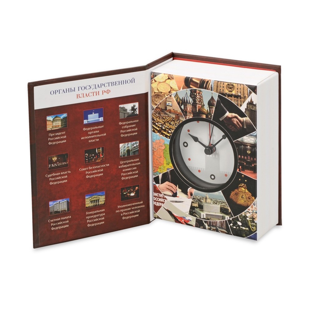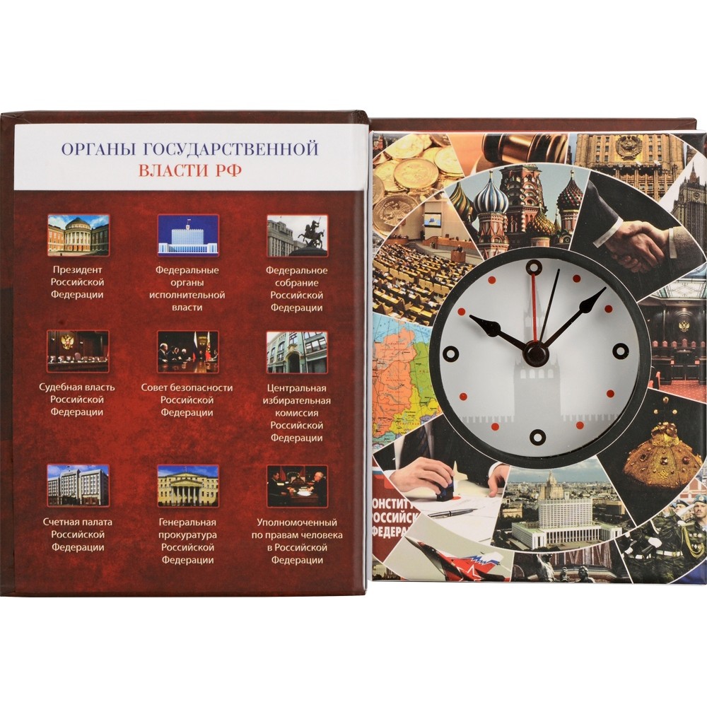Часы в виде книги «Государственное устройство Российской Федерации» подойдут самым серьезным офисам: как в сфере бизнеса, так и для чиновников. Это оригинальный подарок и стильный аксессуар.
