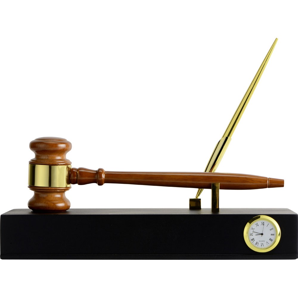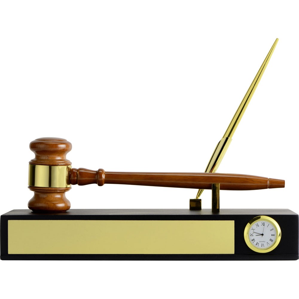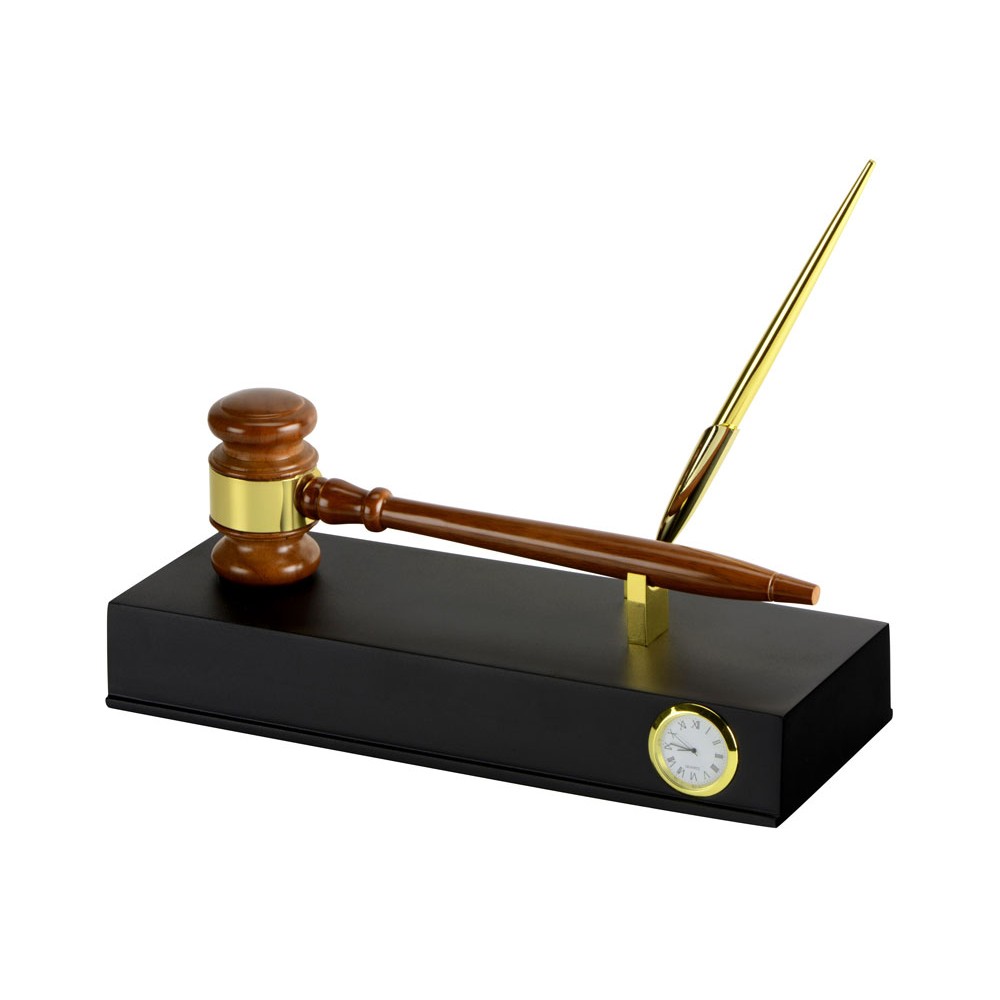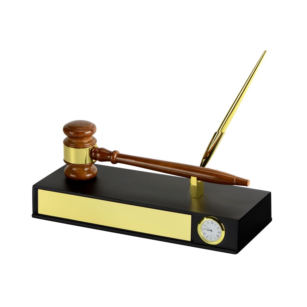 Комплектность подставка с часами 29,3 х 11,7 х 8 см, молоток d4,5 х 7,5 х 26,2 см, ручка шариковая d1 х 17,6 см, шильд 22,2 х 3,5 см