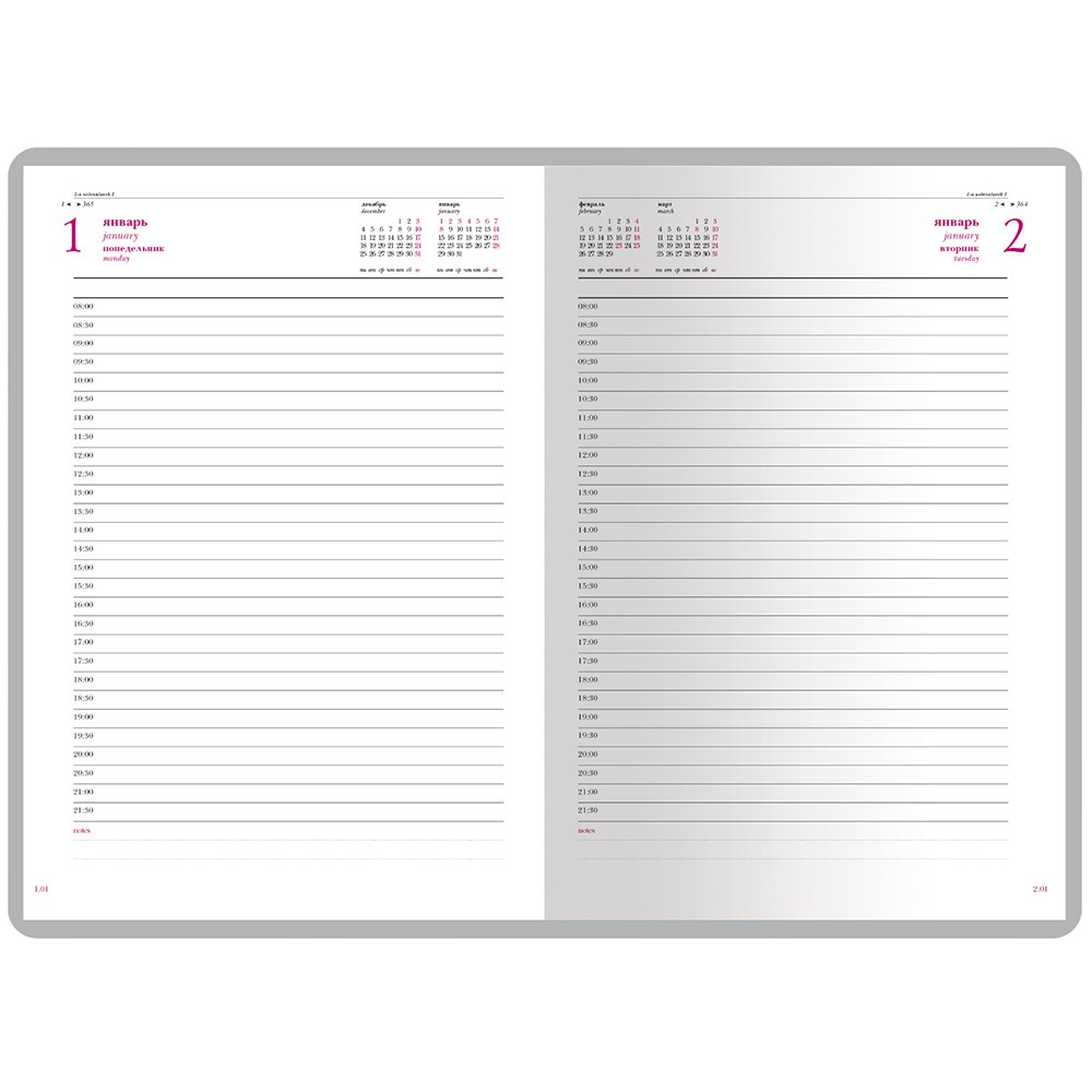 Ежедневник датированный на 2026 год. Его обложка со скруглёнными уголками и с отстрочкой по периметру в цвет выполнена из искусственной кожи нежной и приятной на ощупь.