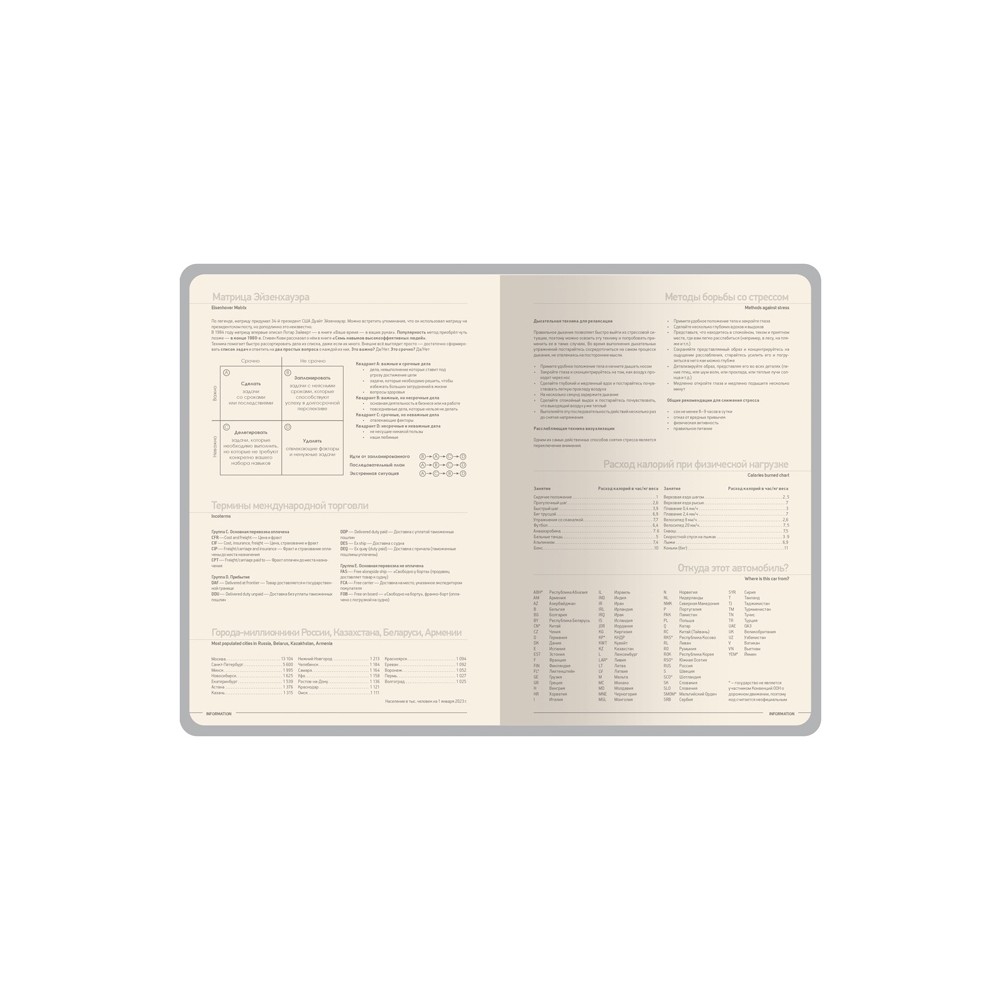 Внутренний блок выполнен из бежевой бумаги плотностью 70 г/кв.м и содержит 14 страниц справочной информации, а также датированные страницы с почасовой разметкой.