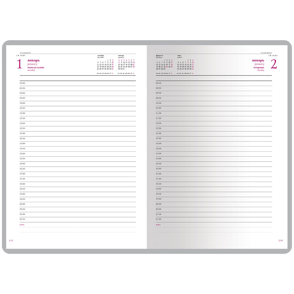 Ежедневник датированный на 2026 год. Его обложка со скруглёнными уголками и с отстрочкой по периметру в цвет выполнена из искусственной кожи нежной и приятной на ощупь.