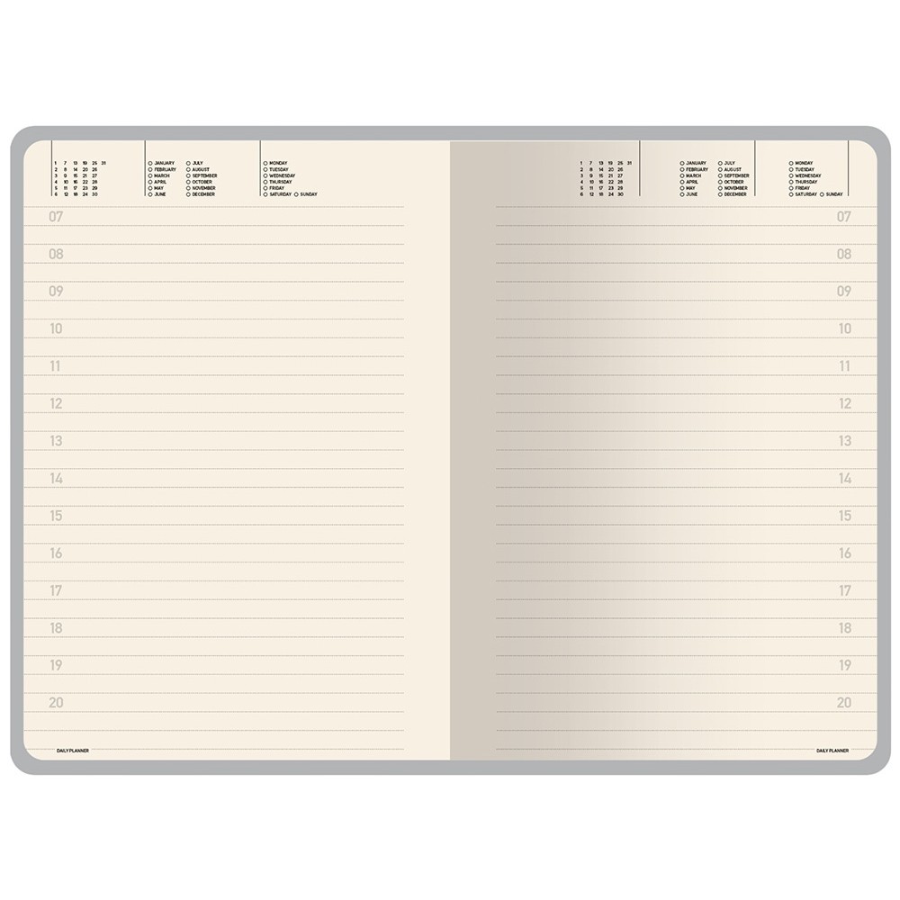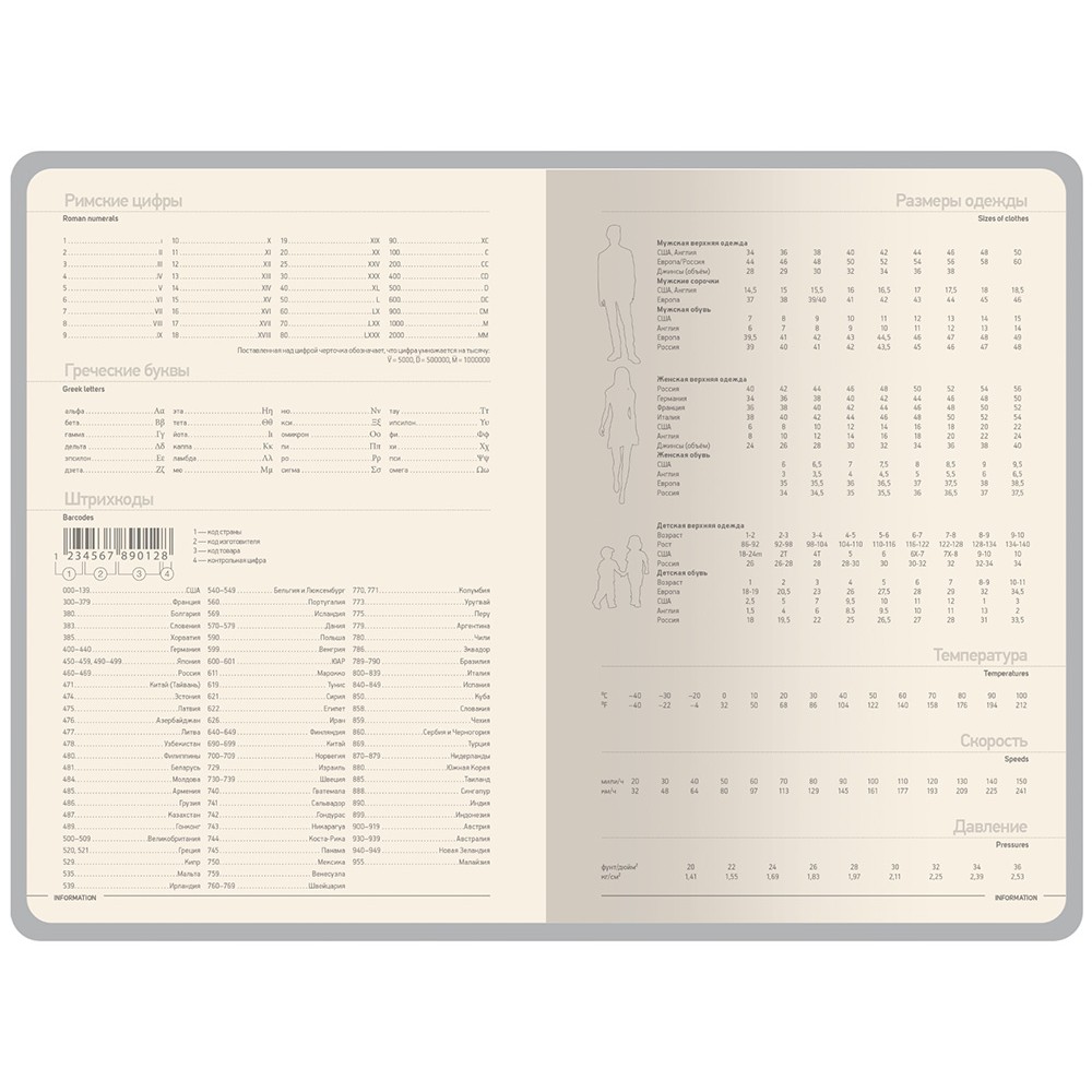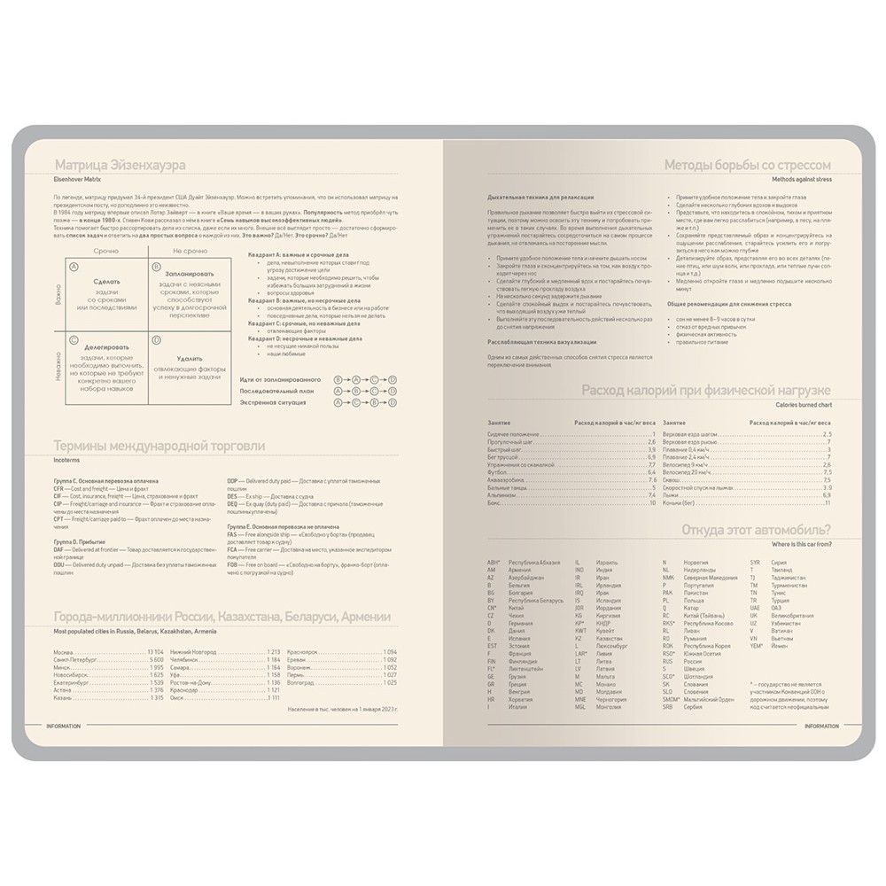 Недатированные страницы в серую линейку имеют отдельное место для проставления числа месяца и дня недели. Справочный блок на 17 страницах содержит полезную информацию из различных областей.