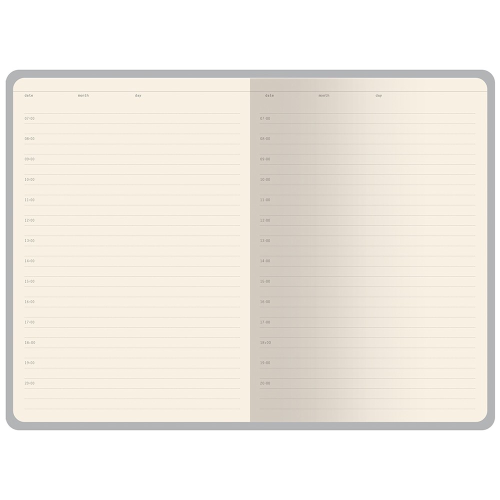 Бумажный блок, закрепленный книжным переплетом, выполнен из бежевой офсетной бумаги плотностью 70 г/ кв м. Внутри блока есть страница для персональных данных, справочная информация на 13 страницах. Блок для записей имеет линовку с указанием временных интервалов в один час.