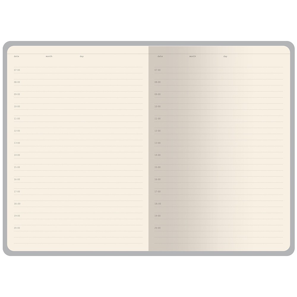 Бумажный блок, закрепленный книжным переплетом, выполнен из бежевой офсетной бумаги плотностью 70 г/ кв м. Внутри блока есть страница для персональных данных, справочная информация на 13 страницах. Блок для записей имеет линовку с указанием временных интервалов в один час.