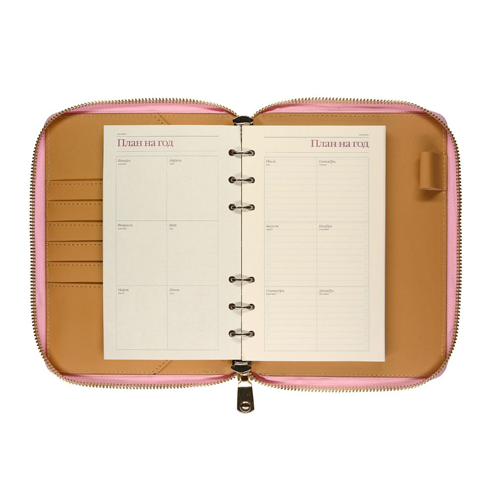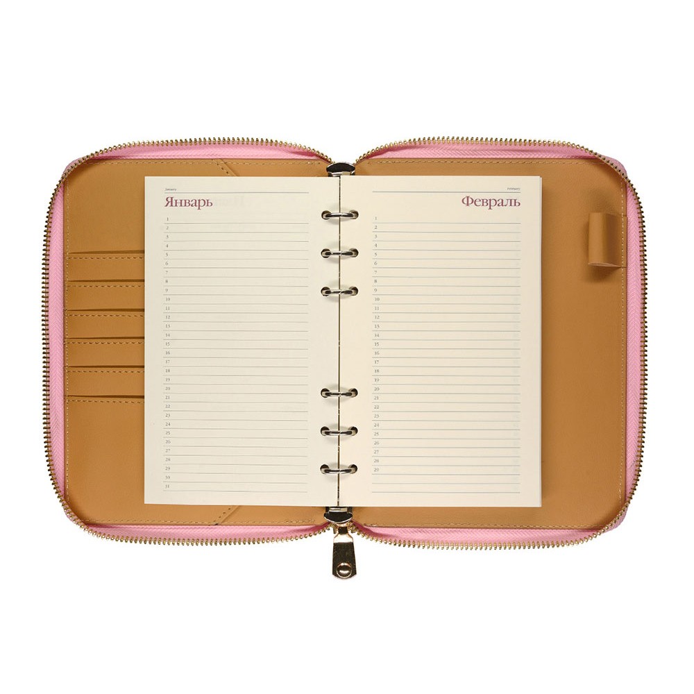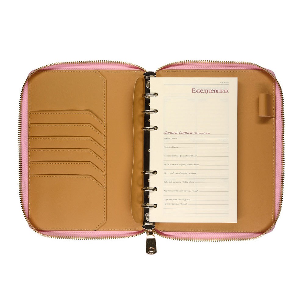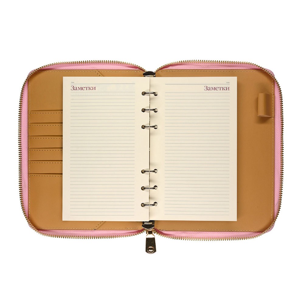 Деловая нежность! Вот как можно охарактеризовать этот очаровательный розово-зефирный ежедневник. Большое отделение на молнии вмещает в себя и сменный блок для записей на кольцевом механизме, и отделения для визиток и ручки. В этом бизнес-аксессуаре поместятся и дополнительные документы и смартфон.