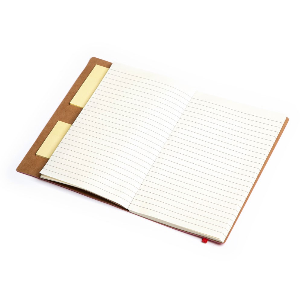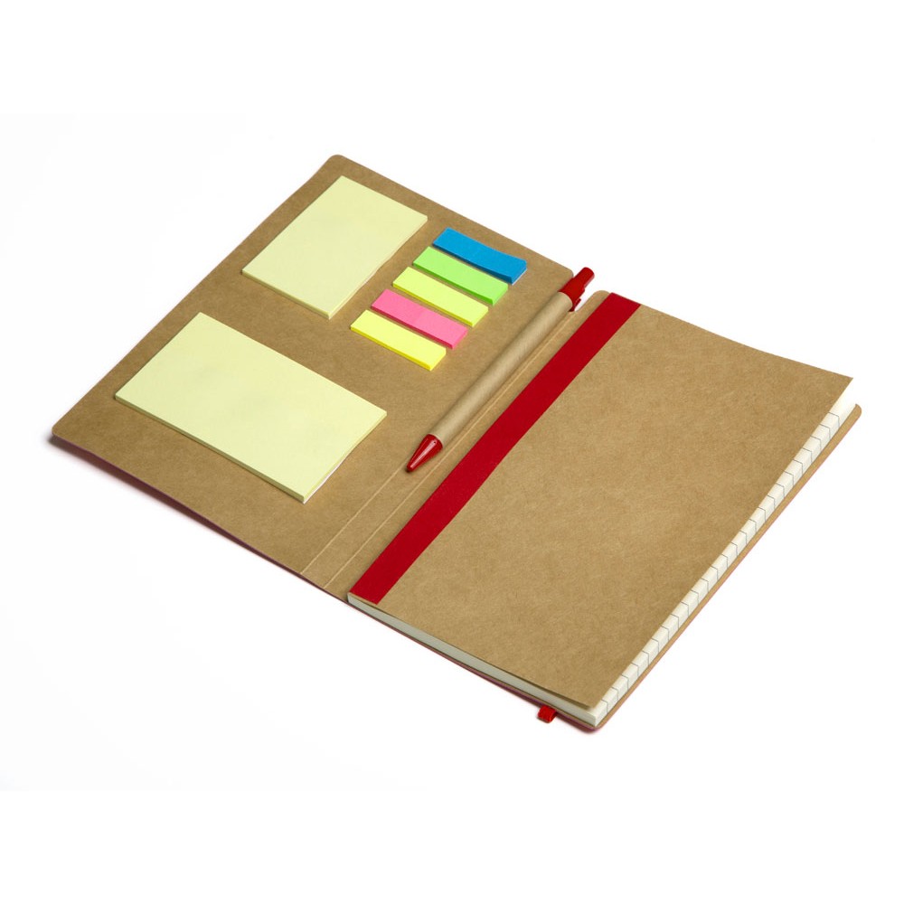 Набор включает в себя разноцветные стикеры разных размеров, блокнот с линованной бумагой и ручку c корпусом из переработанного картона. Обложка выполнена из фактурной искусственной кожи, которая, при тиснении, меняет цвет на более глубокий.