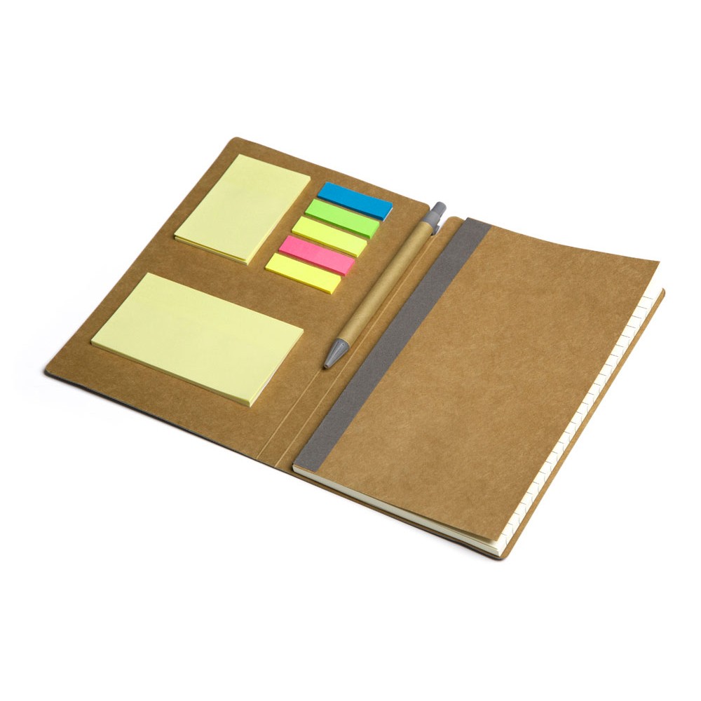 Набор включает в себя разноцветные стикеры разных размеров, блокнот с линованной бумагой и ручку c корпусом из переработанного картона. Обложка выполнена из фактурной искусственной кожи, которая, при тиснении, меняет цвет на более глубокий.