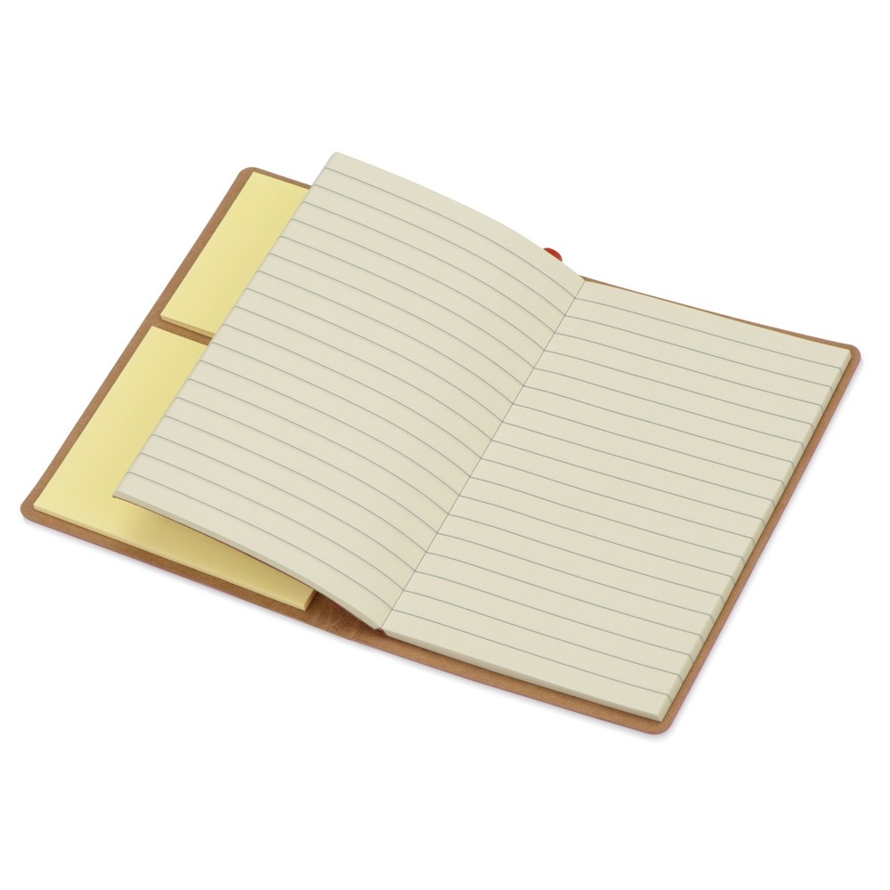 Компактный набор включает в себя разноцветные стикеры разных размеров, блокнот с линованной бумагой и ручку c корпусом из переработанного картона. Обложка выполнена из фактурной искусственной кожи, которая, при тиснении, меняет цвет на более глубокий.