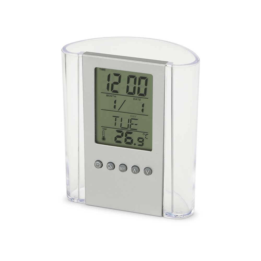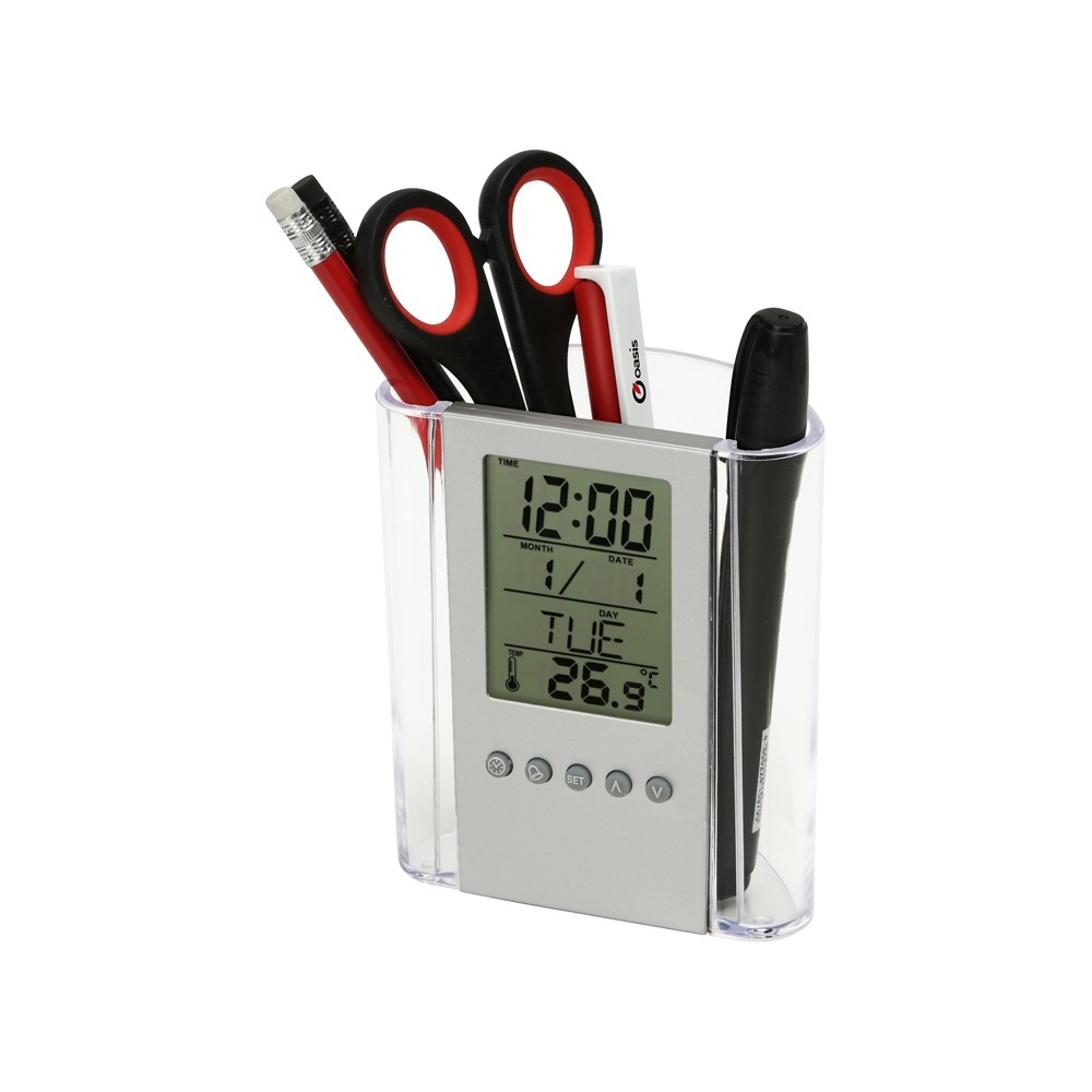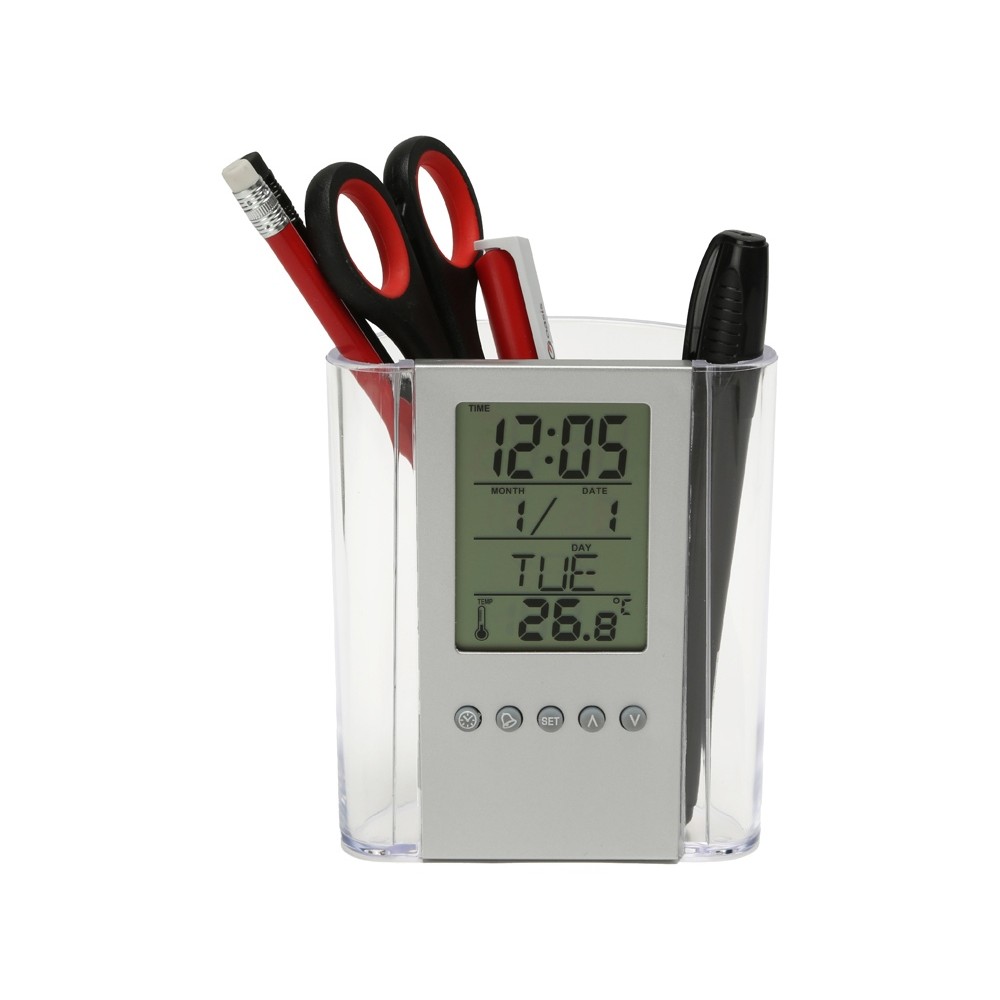 Чрезвычайно практичный элемент Вашего рабочего стола подскажет время, температуру и даже дату, а ещё вместит в себя канцелярские принадлежности. Часы оснащены будильником. Полный порядок на столе плюс комфорт за приемлемую цену.