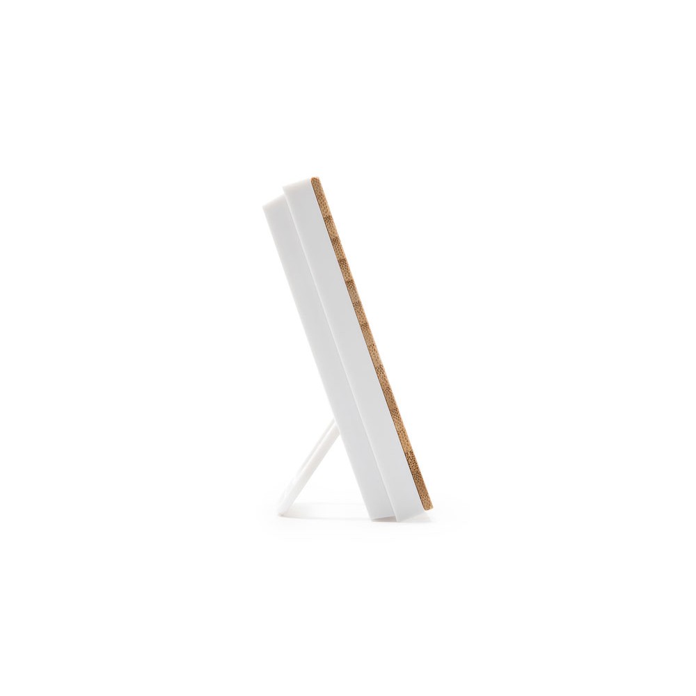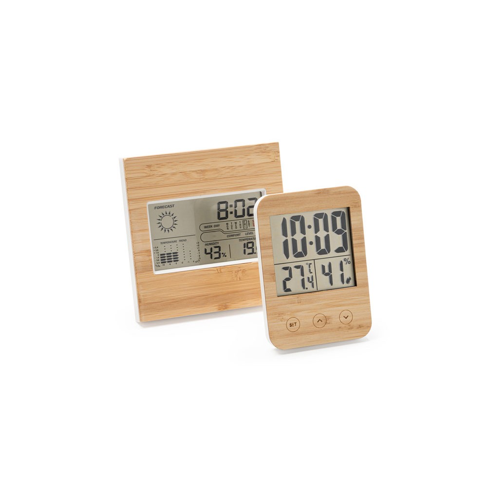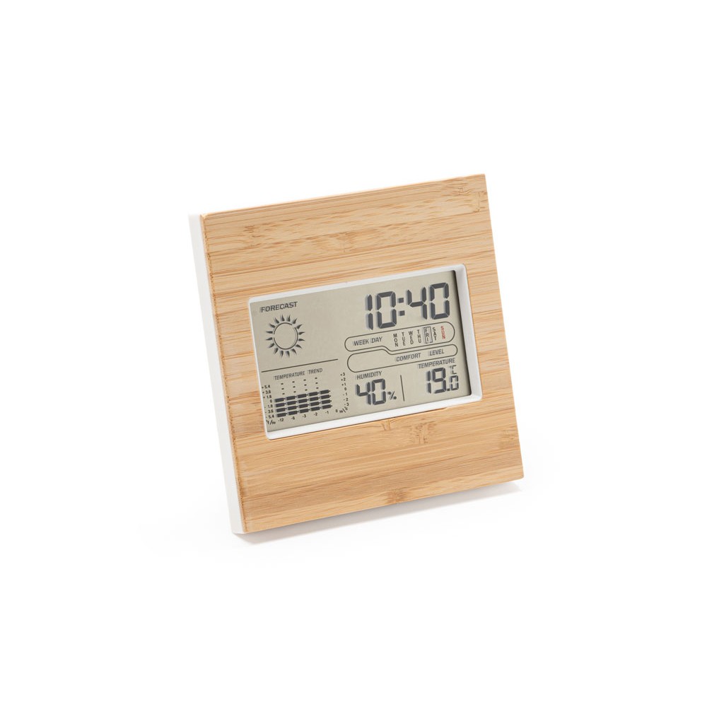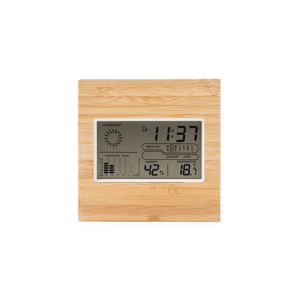 Метеостанция с лицевой стороной из бамбука. Часы, календарь и функция будильника с датчиками температуры и влажности. Запись максимальной и минимальной температуры и влажности. Работает от 2 батареек типа ААА (не входят в комплект).