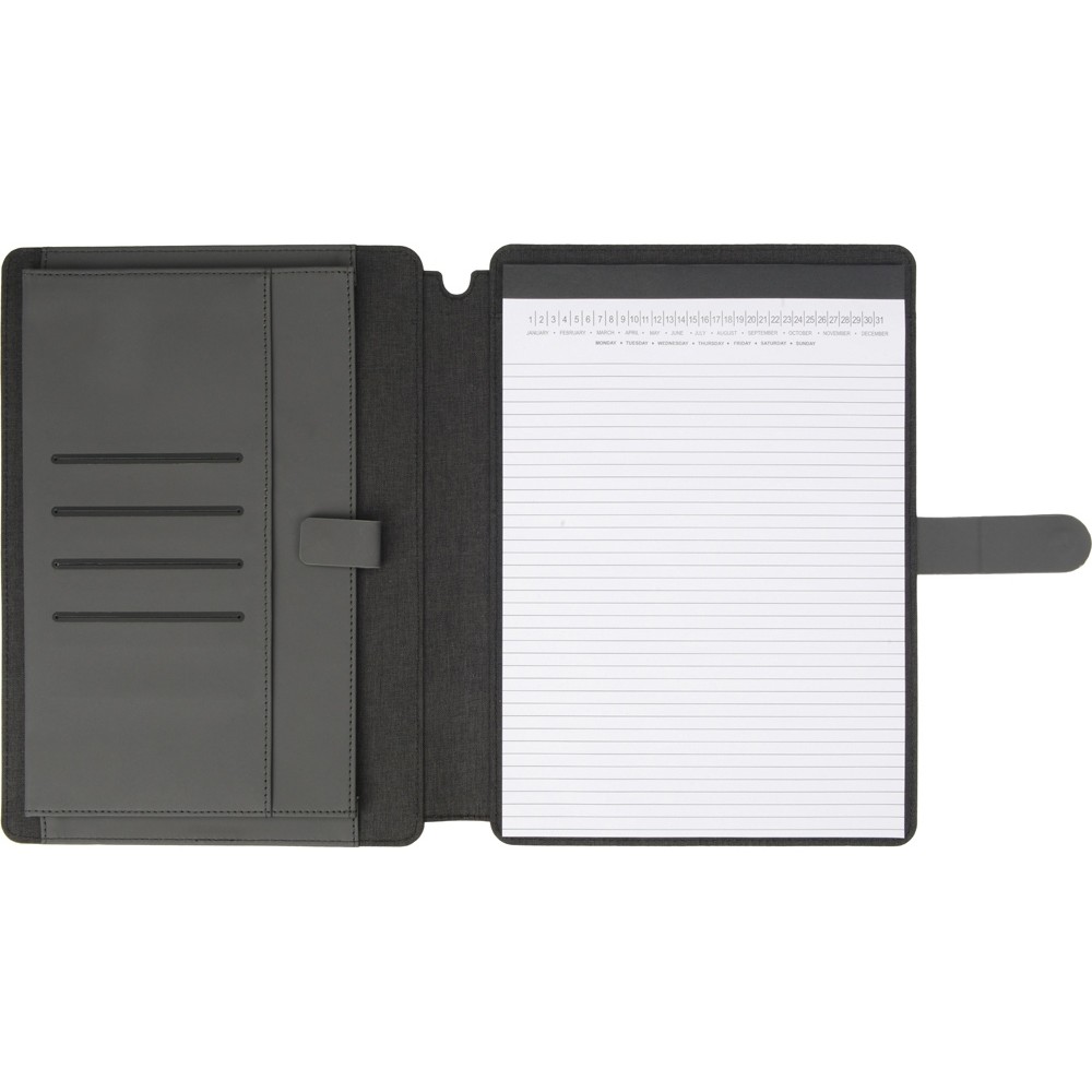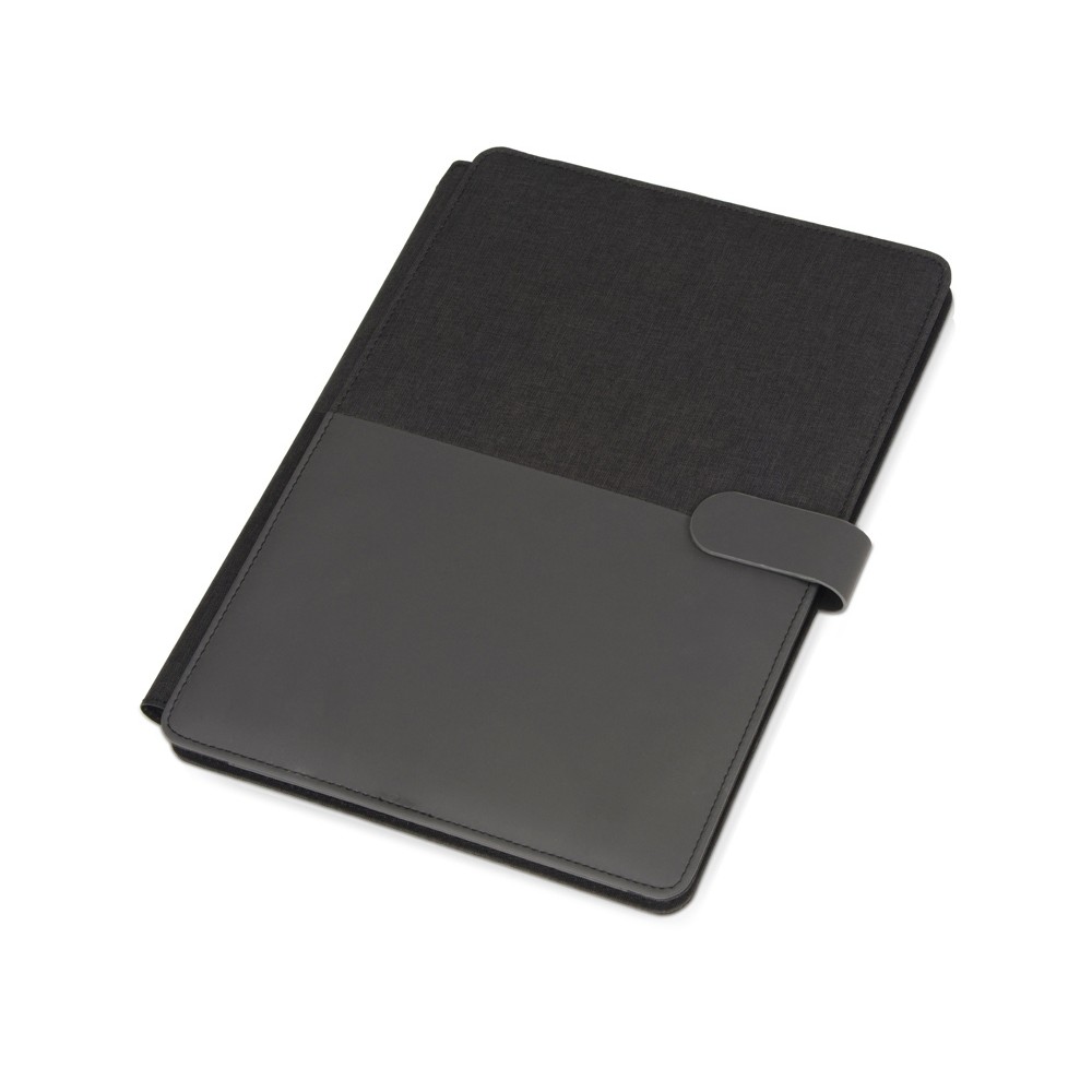 Стильная папка для документов формата А4 с комбинированной обложкой из текстиля и искусственной кожи. Удобный внутренний органайзер имеет карман на застёжке для планшета, блокнот для записей с линованной бумагой.