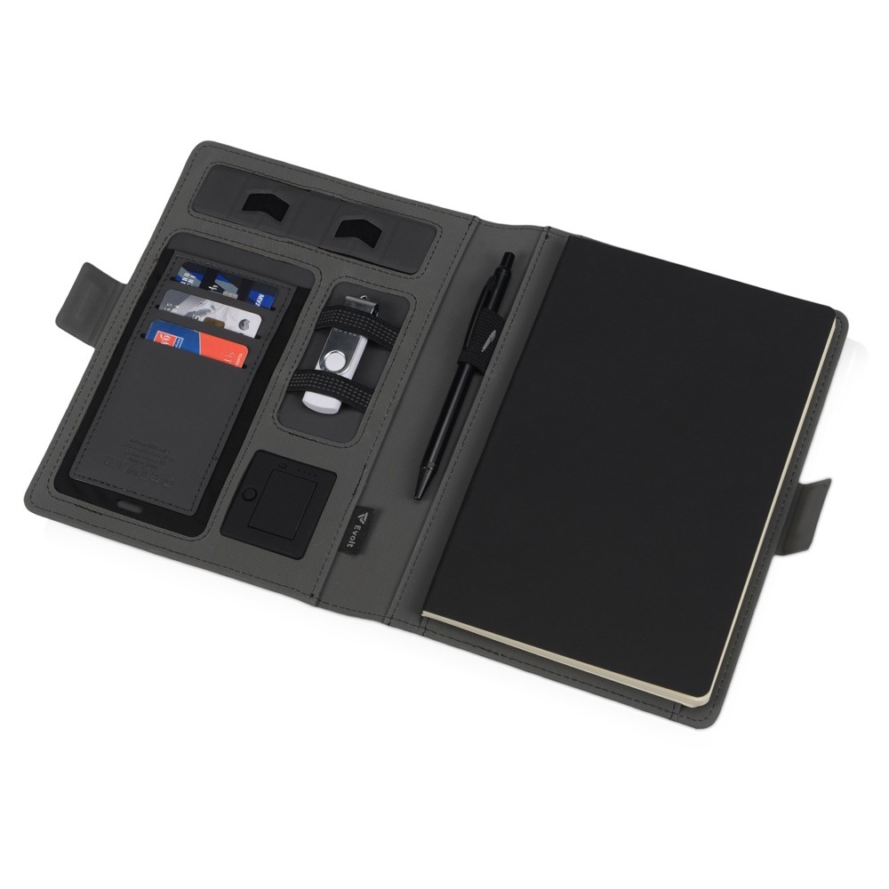 Органайзер «Powernote» — стильный бизнес-подарок, который в полной мере воплощает идею многофункциональности. С его помощью можно заряжать гаджеты как беспроводным способом, так и через кабель, эргономично хранить целый ряд предметов — от ручек и проводов до кредитных карт — и даже делать записи. Элегантность внешнего вида дополняется приятной текстурой обложки из мягкого полиэстера и высоким качеством внутренней отделки с элементами soft-touch покрытия. Практичный и технологичный аксессуар, который в состоянии заменить сразу несколько вещей.