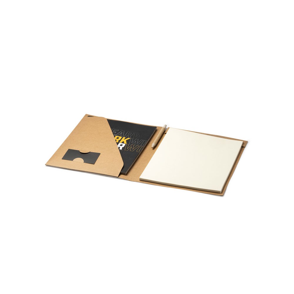 Папка из переработанного картона. Съемный блокнот на 20 листов, ручка в тон из пшеничного волокна, внутренний карман и картхолдер в комплекте.