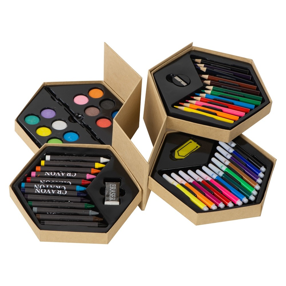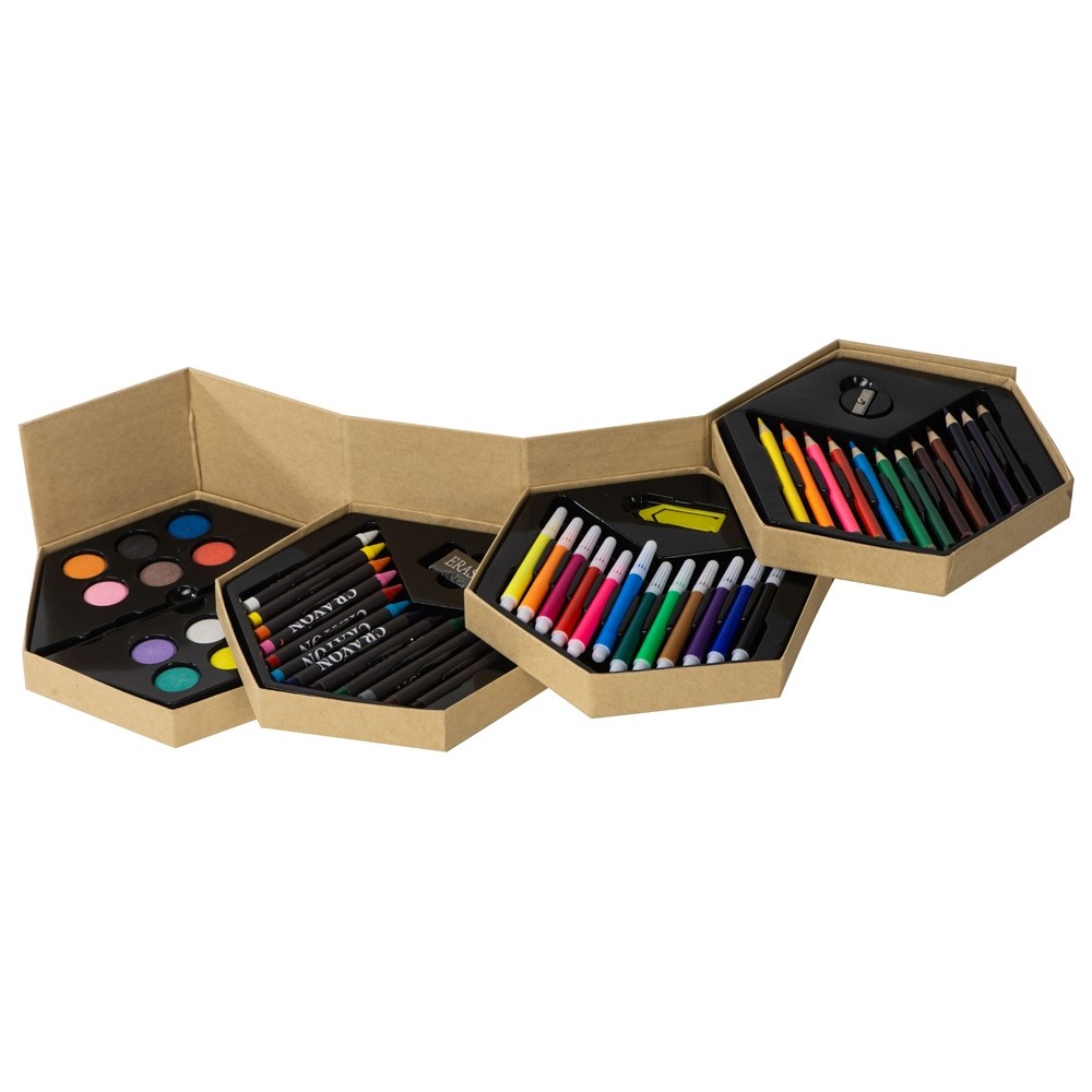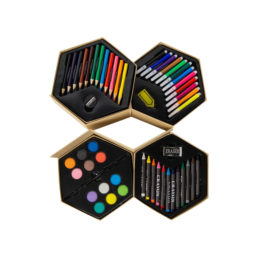 Набор из 52 предметов для рисования. 12 маркеров, 12 цветных карандашей, 12 восковых карандашей, 12 акварельных красок, кисточка, точилка, резинка и большая скрепка.