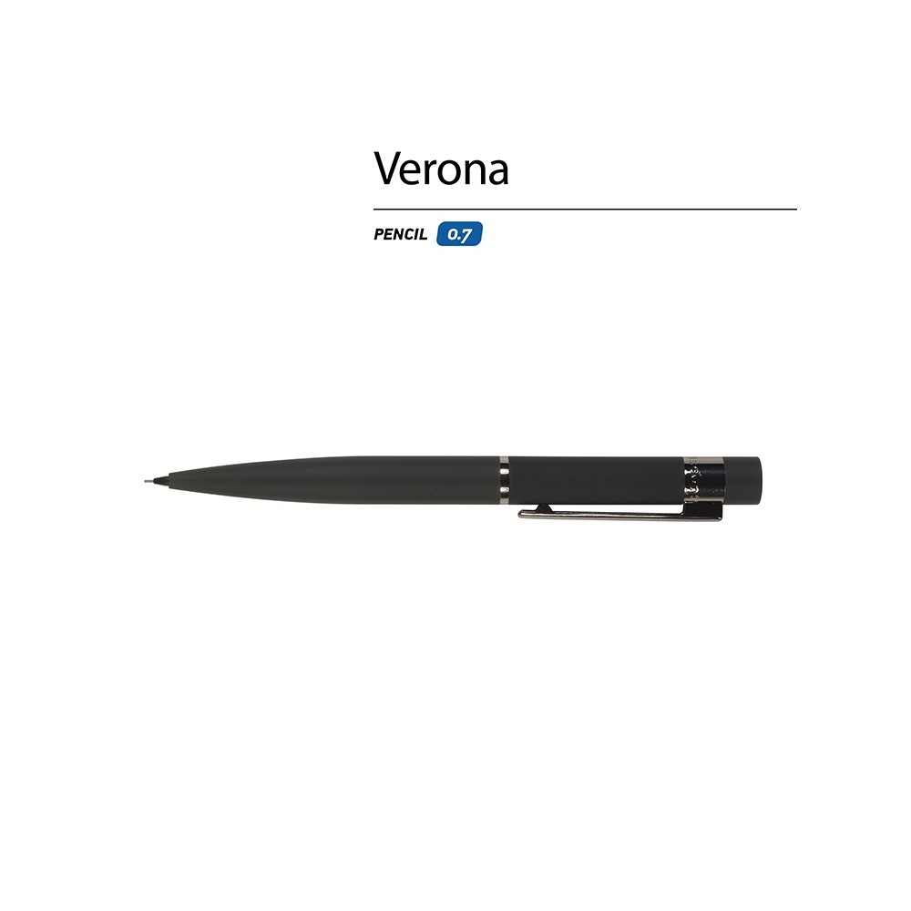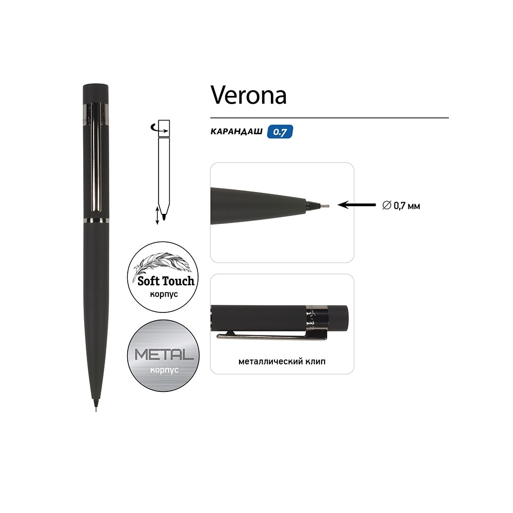Механический карандаш «Verona» - аксессуар, призванный стать настоящим элементом стиля, подчеркнуть индивидуальность его владельца. Несмотря на увеличенный диаметр корпуса - 12 мм, он смотрится элегантно благодаря плавным линиям, эргономичному корпусу с покрытием Soft Touch. Контраст добавляют кольцо и клип из глянцевого темного металла. Сам стержень легко и бесперебойно выдвигается за счет мягкого поворотного механизма подачи, производитель которого гарантирует долгий срок эксплуатации. Отличный вариант для повседневной работы.