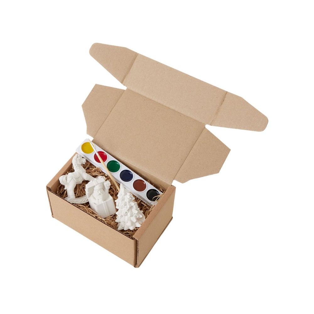 В набор входят три гипсовых фигурки — лошадка-качалка, елочка и подарочная коробка с Дедом Морозом, а также акварельные краски и кисть.