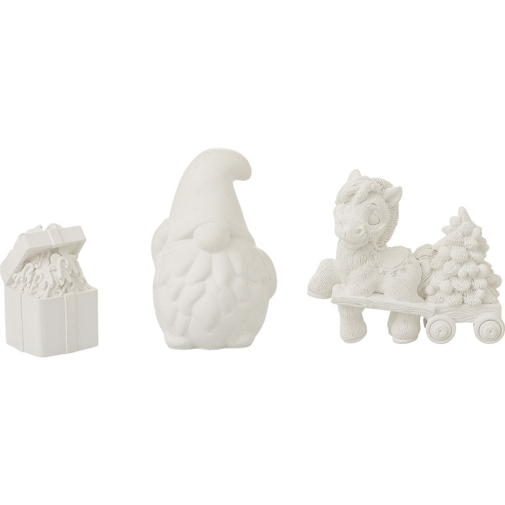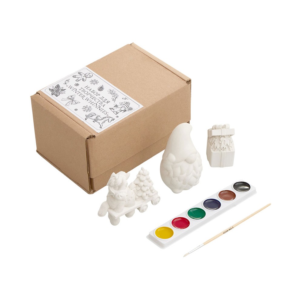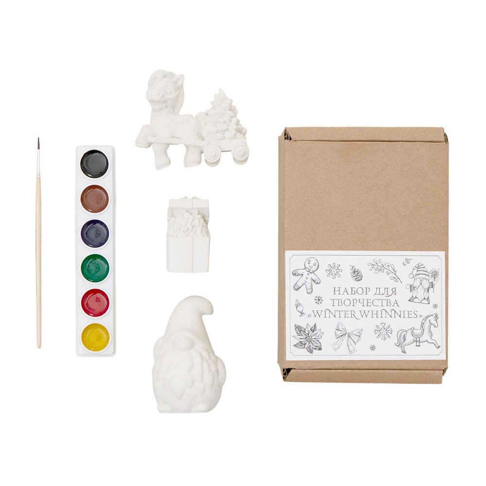 В набор входят три гипсовых фигурки — лошадка елочкой, гном подарочная коробка с пряничными человечками, а также акварельные краски и кисть.