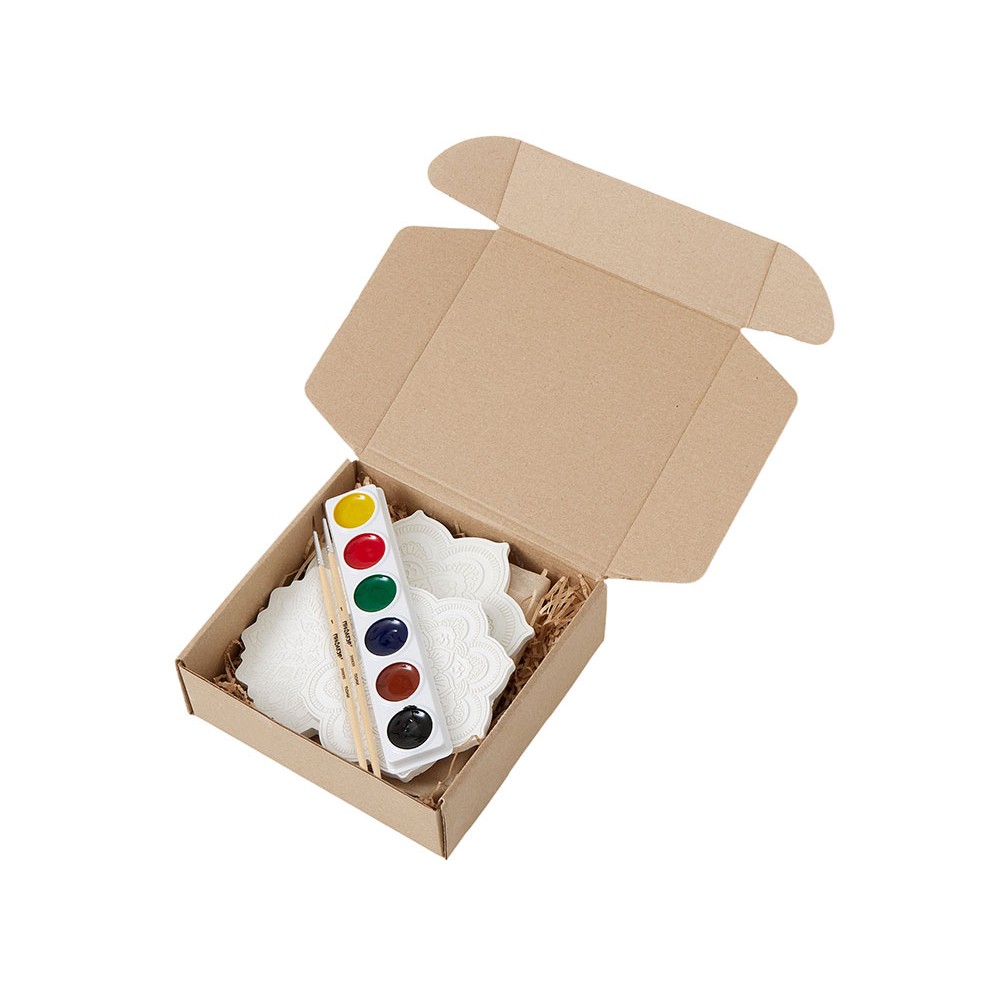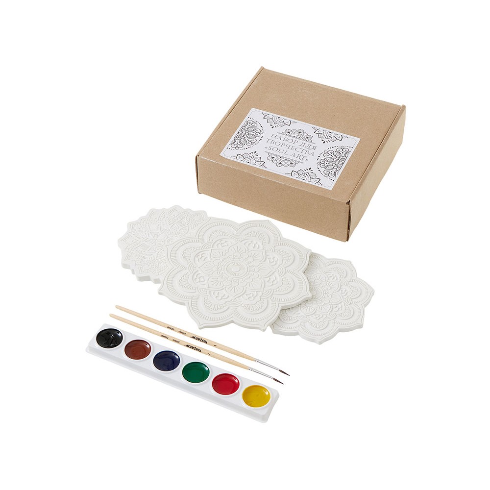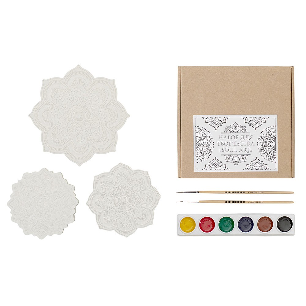 В набор входят три гипсовых фигурки мандал, а также акварельные краски и 2 кисти - более тонкая для прокраски самых тонкие деталей и чуть более толстая.