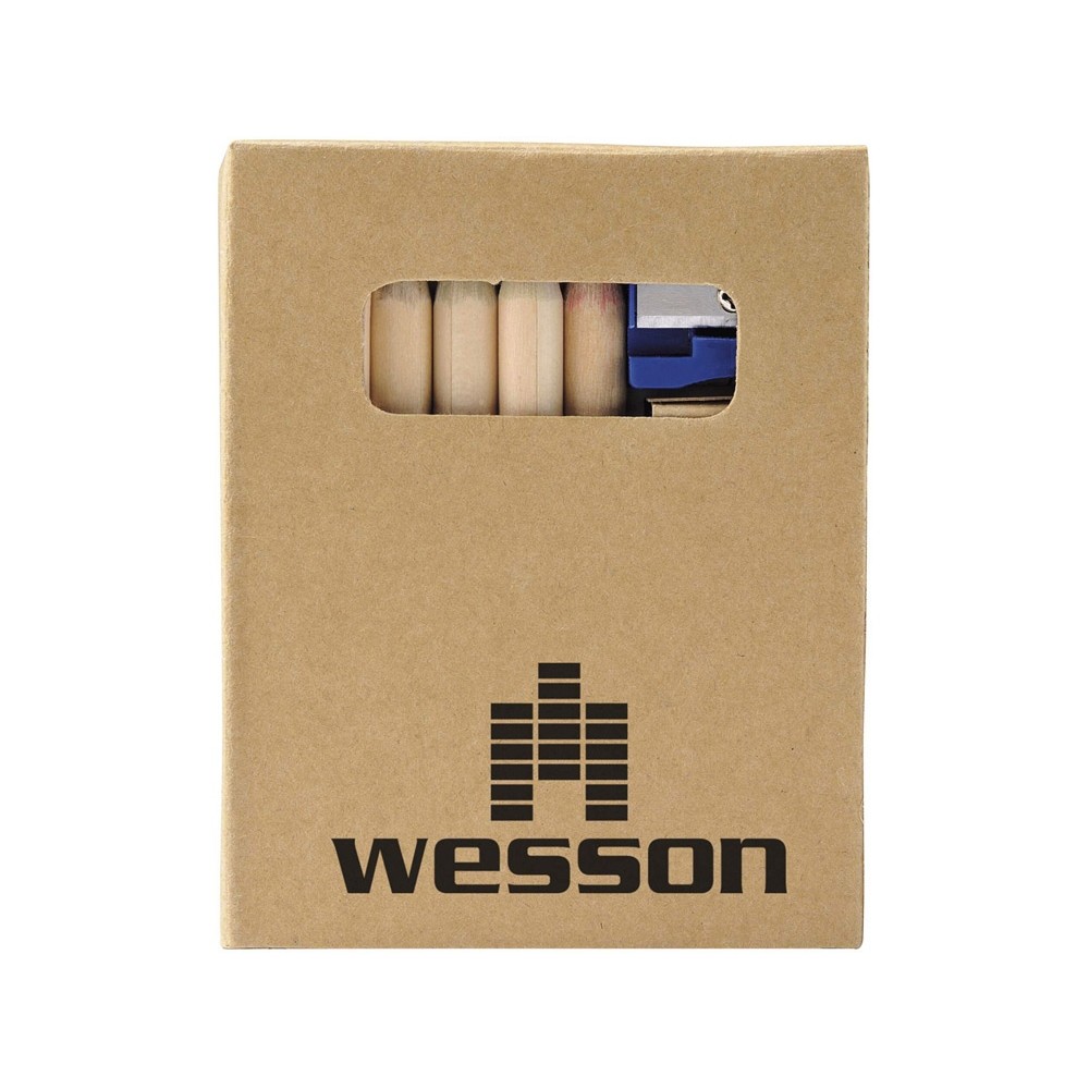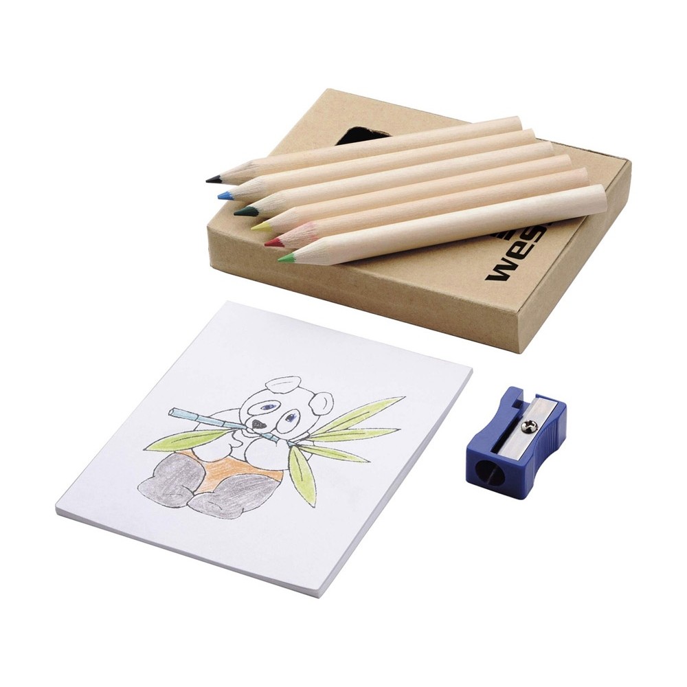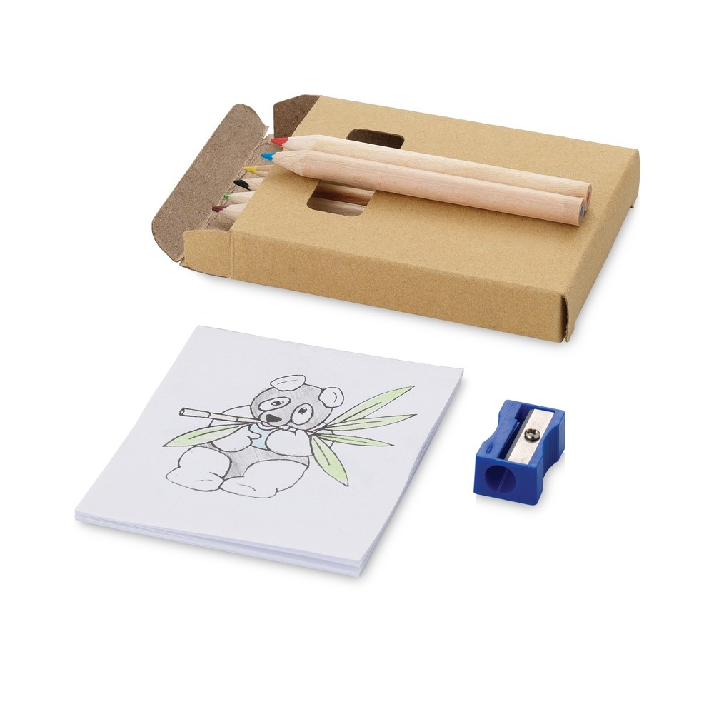 Оригинальный набор для рисования будет отличным промо-сувениром для любой акции креативного направления. Также отлично подойдет для продвижения дизайнерской студии. В наборе 6 цветных карандашей, точилка и раскраска. Комплект упакован в картонную коробку.
