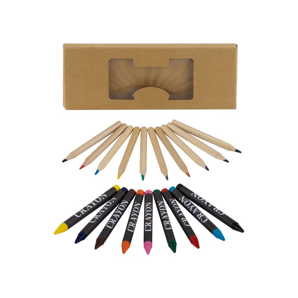 Набор из 19 карандашей. 9 цветных восковых карандашей и 10 цветных карандашей в картонной коробке с пластиковым окошком.