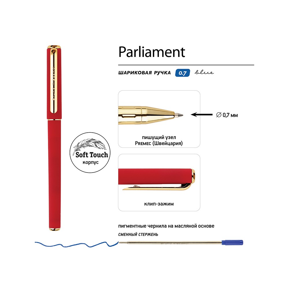 Ручка "Parliament" с чернилами на масляной основе синего цвета отличается мягким письмом и толщиной линии 0,5 мм. Ее прорезиненный корпус soft-touch обеспечивает комфорт при длительном использовании, а отвинчивающийся наконечник облегчает доступ к сменному стержню. Колпачок с клип-зажимом обеспечивает удобное крепление ручки на одежде или сумке. Качество письма обеспечивается премиальным швейцарским пишущим узлом диаметром 0,7 мм от производителя Premec и немецкими чернилами марки Dokumental. Ручка упакована в индивидуальную подарочную упаковку.