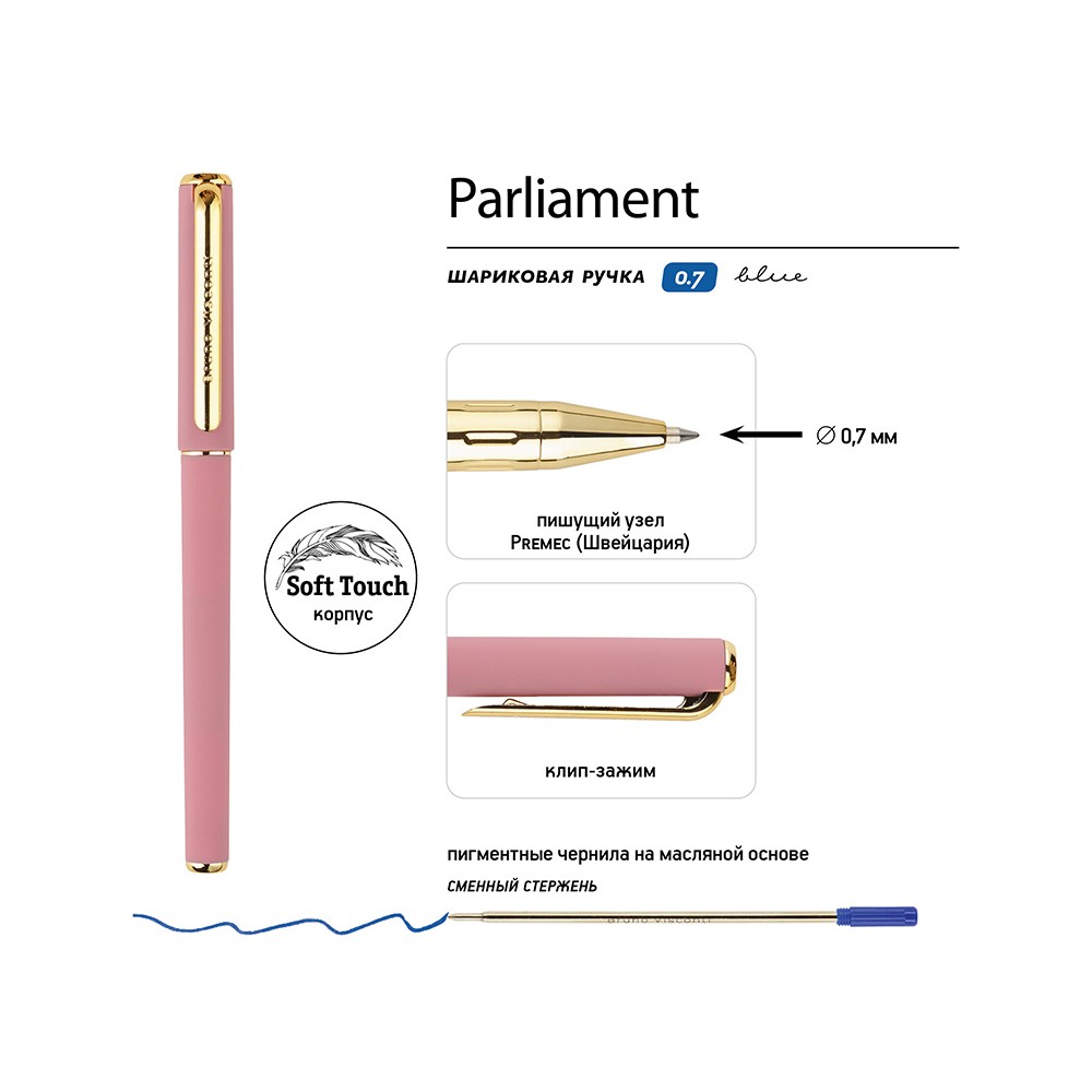 Технические характеристики Ручка пластиковая шариковая "Parliament", 0,7 мм, синие чернила, розовый/золотистый