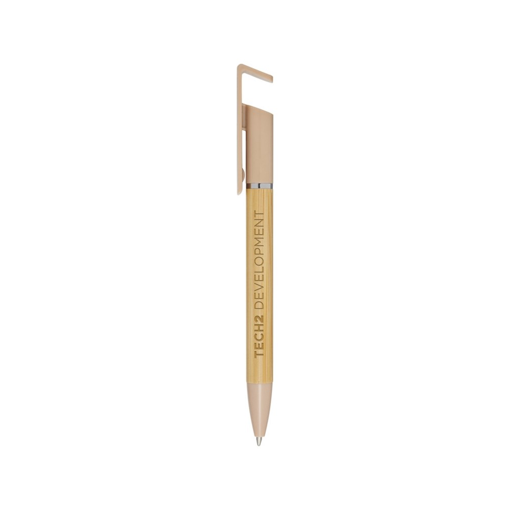 Бамбуковая шариковая ручка, которая также может служить подставкой для телефона. Кнопка и среднее кольцо изготовлены из переработанного пластика, наконечник — из латуни, а корпус — из бамбука, полученного из ответственных источников. Цвет чернил: черный. Длина непрерывной линии: 1000 метров. Размер пера: 1,0 мм. FSC certified bamboo. FSC Mix Credit N5 CU-COC-877277.
