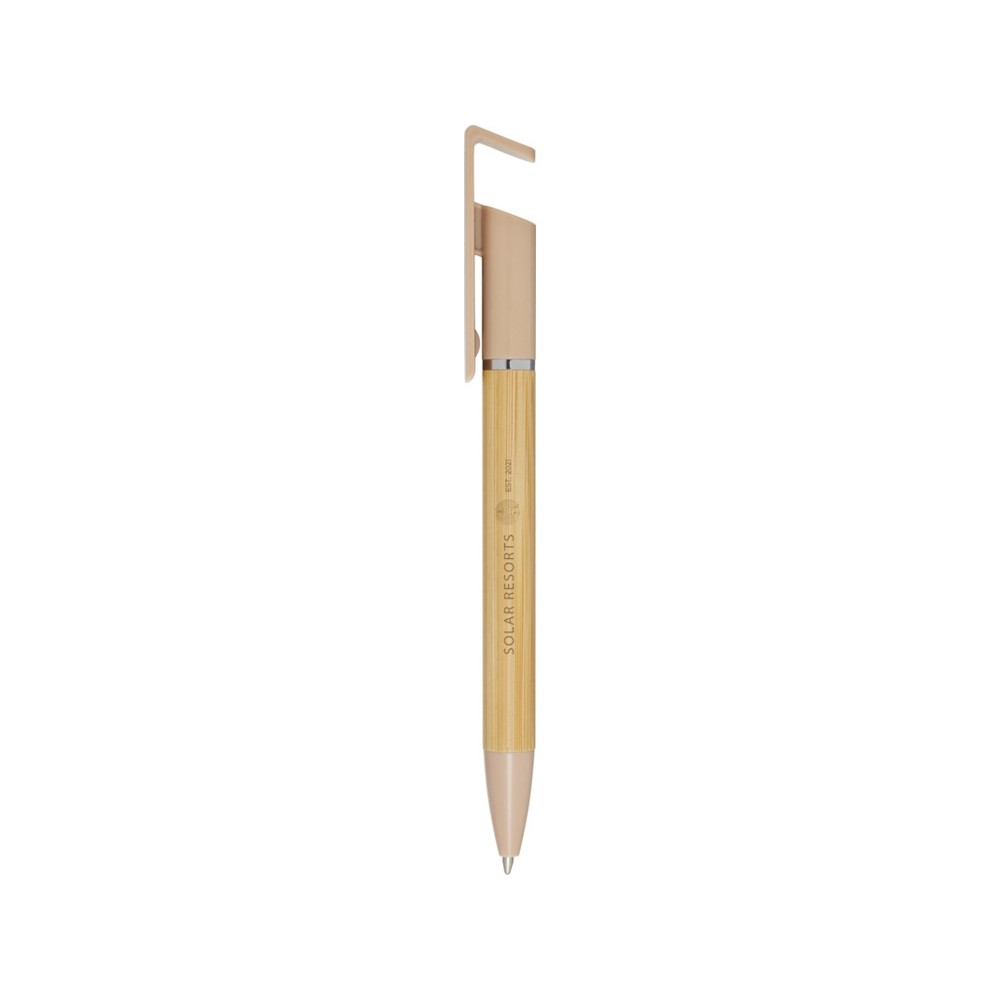 Бамбуковая шариковая ручка, которая также может служить подставкой для телефона. Кнопка и среднее кольцо изготовлены из переработанного пластика, наконечник — из латуни, а корпус — из бамбука, полученного из ответственных источников. Цвет чернил: синий. Длина непрерывной линии: 1000 метров. Размер пера: 1,0 мм. FSC certified bamboo. FSC Mix Credit N5 CU-COC-877277.