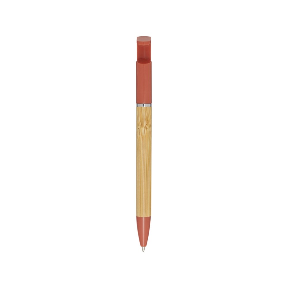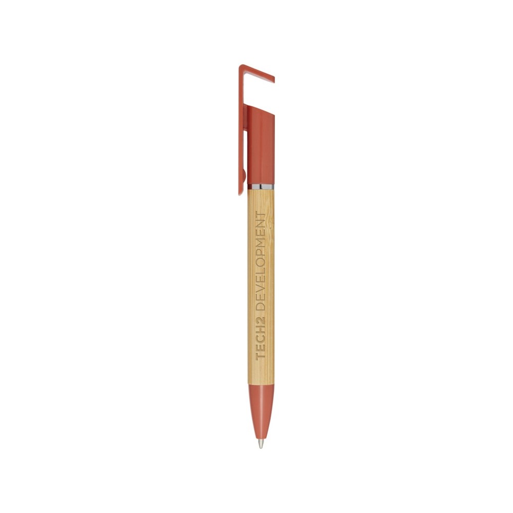 Бамбуковая шариковая ручка, которая также может служить подставкой для телефона. Кнопка и среднее кольцо изготовлены из переработанного пластика, наконечник — из латуни, а корпус — из бамбука, полученного из ответственных источников. Цвет чернил: синий. Длина непрерывной линии: 1000 метров. Размер пера: 1,0 мм. FSC certified bamboo. FSC Mix Credit N5 CU-COC-877277.