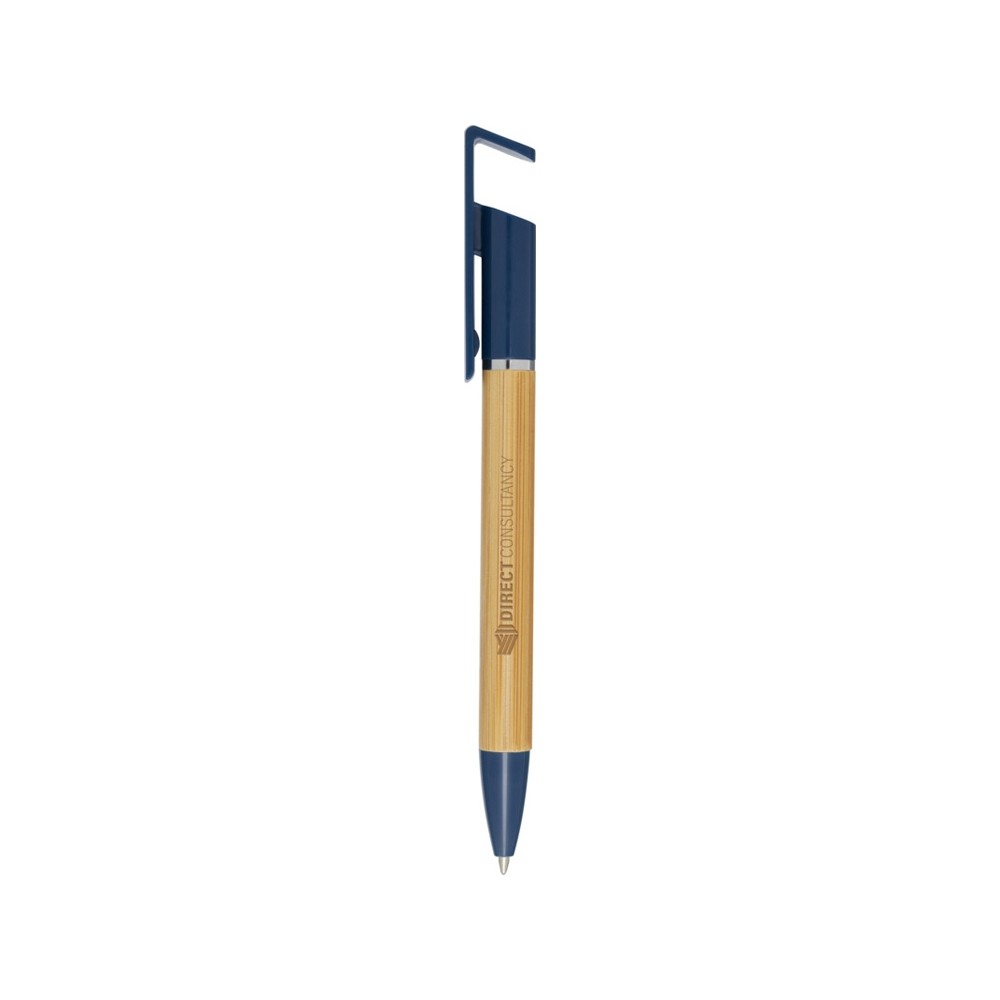Бамбуковая шариковая ручка, которая также может служить подставкой для телефона. Кнопка и среднее кольцо изготовлены из переработанного пластика, наконечник — из латуни, а корпус — из бамбука, полученного из ответственных источников. Цвет чернил: синий. Длина непрерывной линии: 1000 метров. Размер пера: 1,0 мм. FSC certified bamboo. FSC Mix Credit N5 CU-COC-877277.