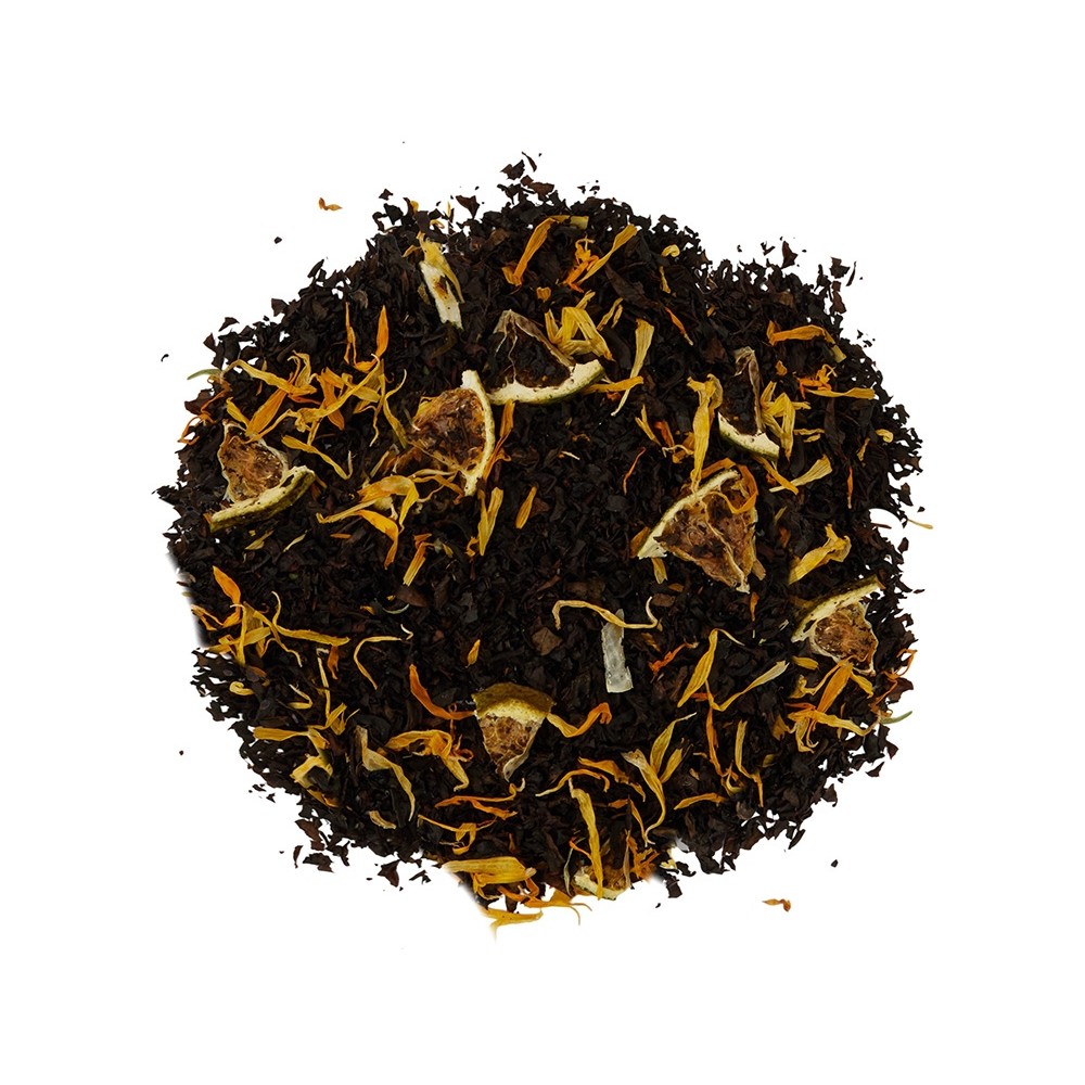 Состав черный чай, лепестки календулы, слайсы мандарина, ароматизатор натуральный "Глинтвейн", ароматизатор натуральный "Мандарин"