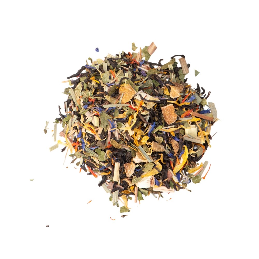 - состав сбора: чай чёрный индийский листовой, смородина лист, лимонная трава, цедра лимона, лепестки василька, лепестки календулы, липа цвет, ежевика лист, лепестки сафлора, мята, имбирь;